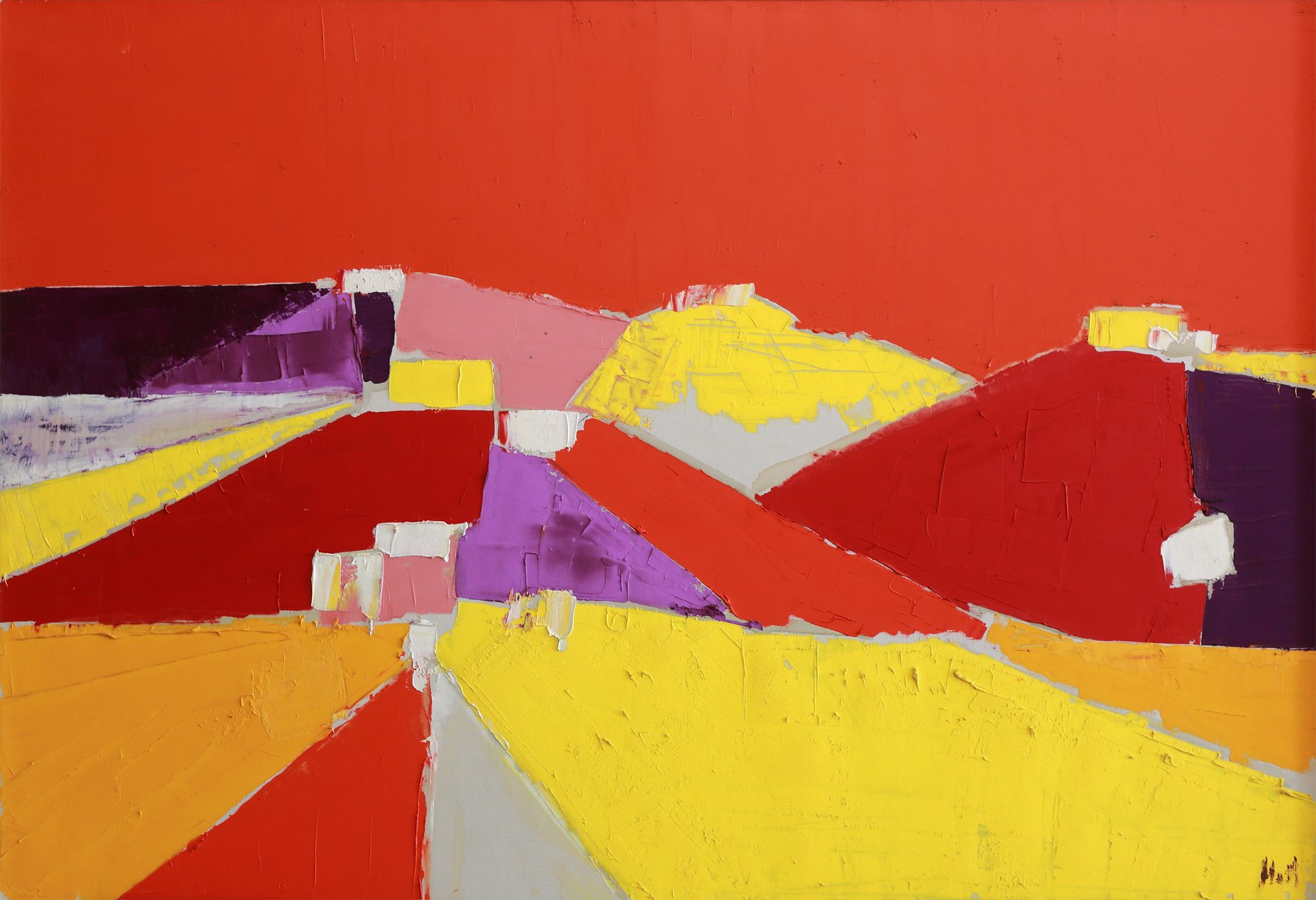 Abstraction de polygones croisés de violet, rouge, orange, blanc, jaune