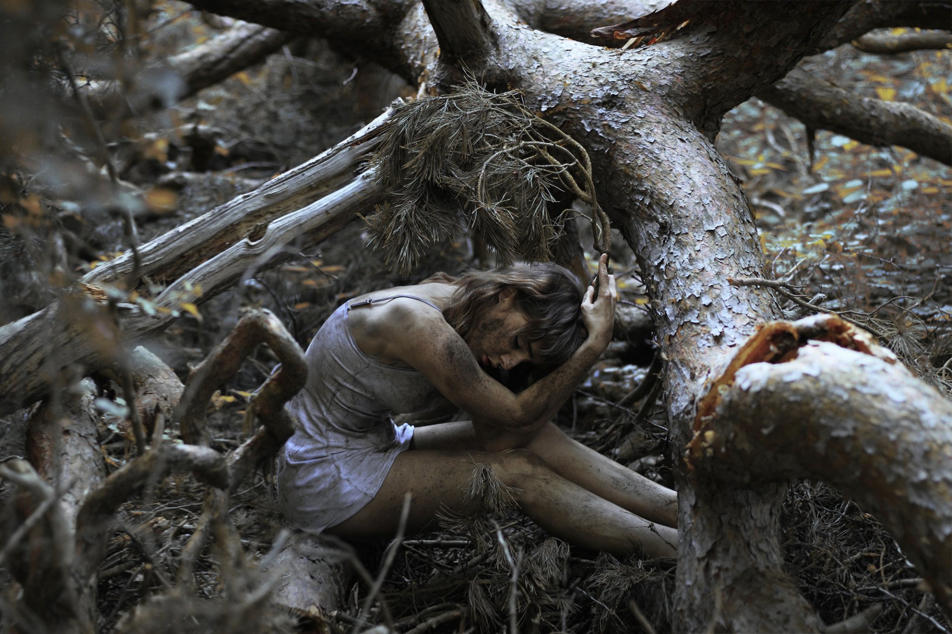Jolie fille, assise dans une sale de la forêt, tout autour des arbres