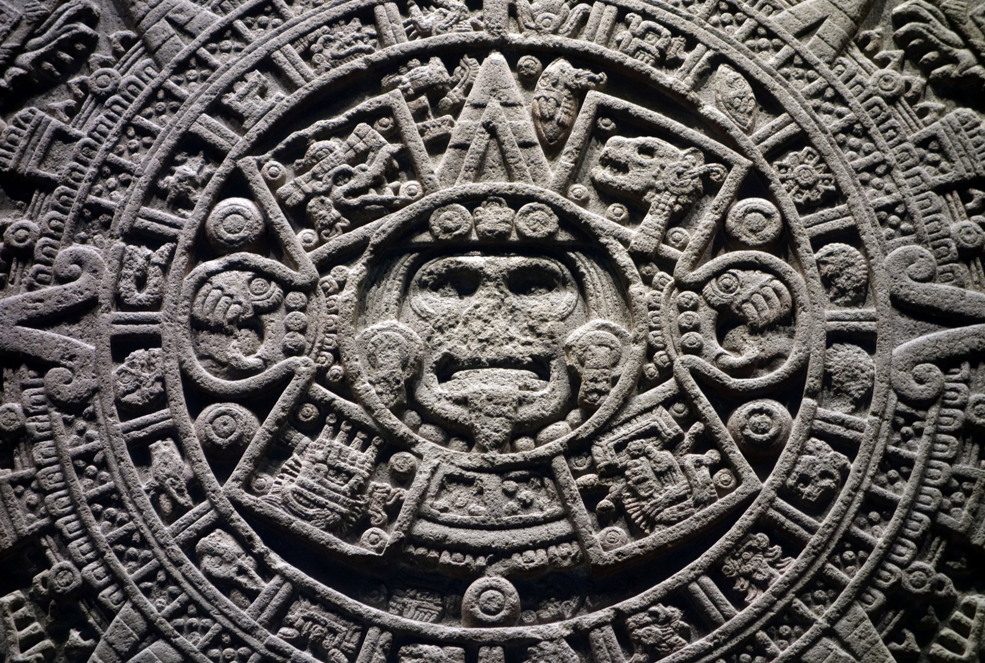 Calendrier aztèque ou symboles inhabituels sur un emblème rond sur fond noir