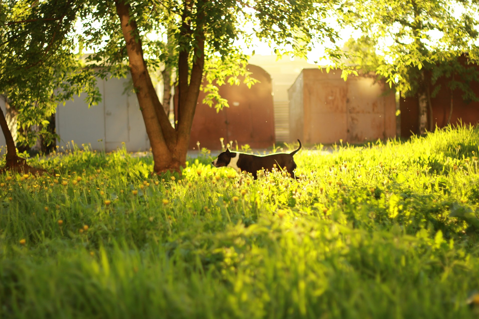 Chien sur l'herbe à côté d'un arbre dans les feuilles