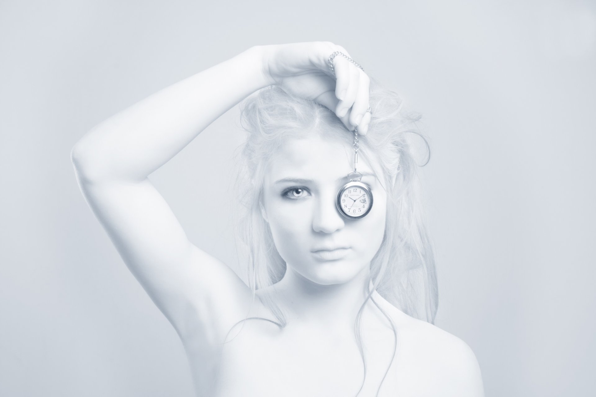 Portrait d'une jeune fille avec une horloge dans un style blanc