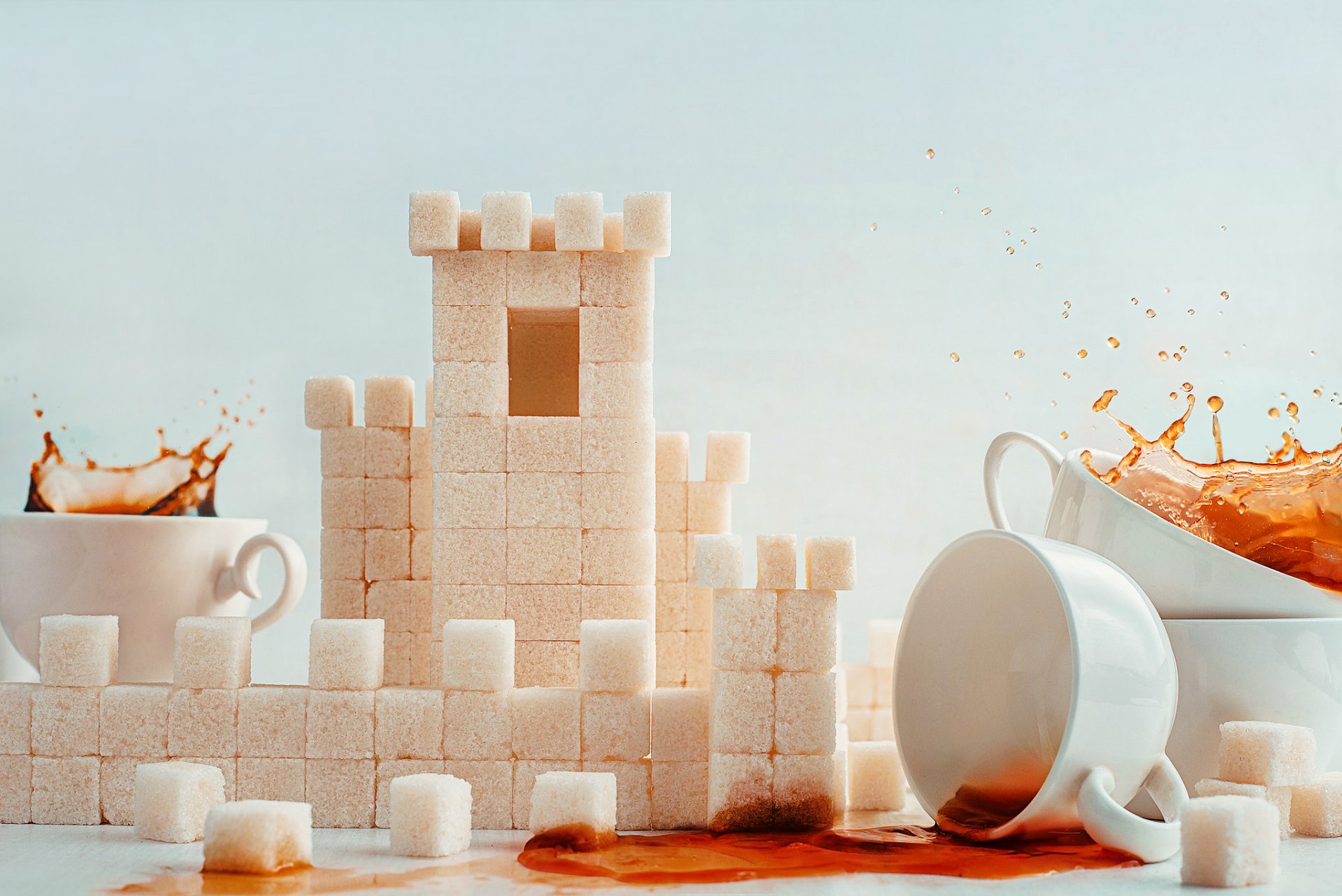 Château de la belle de sucre raffiné, avec des tasses de thé chaud