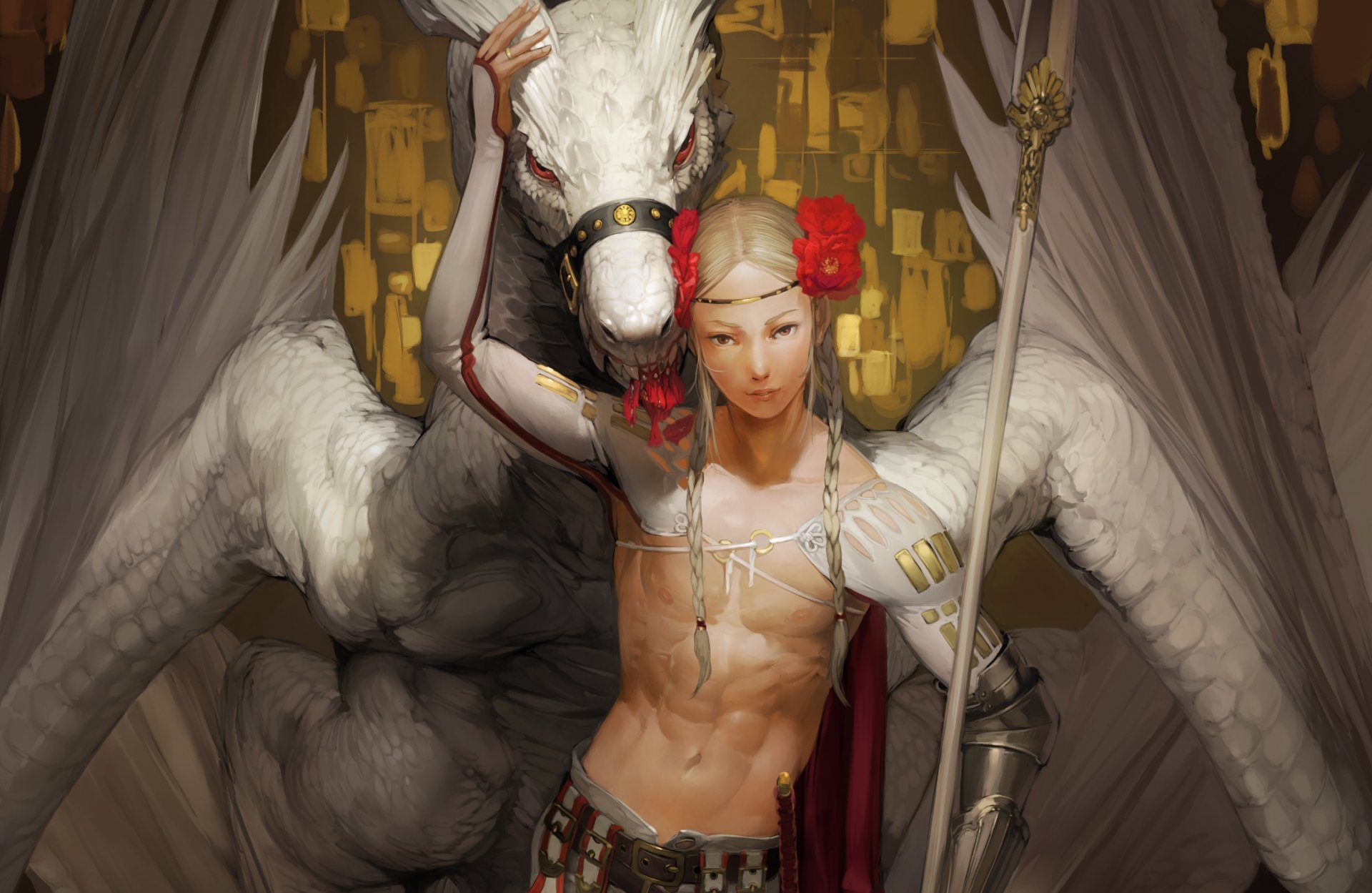 Art d'un samouraï japonais avec des tresses dans un casque de la tête d'un dragon dans une armure rouge et blanche sur un fond de dragon blanc