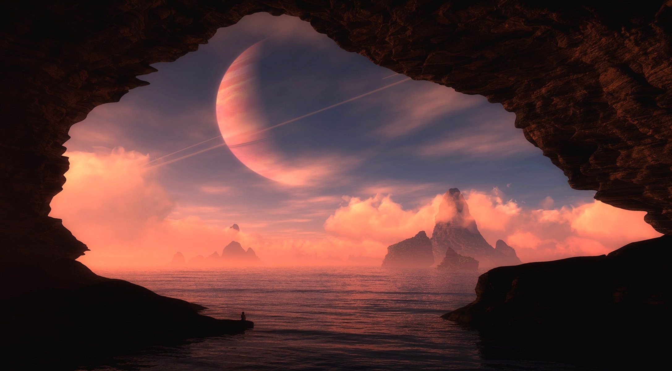Paysage de montagne cosmique avec des planètes dans le ciel