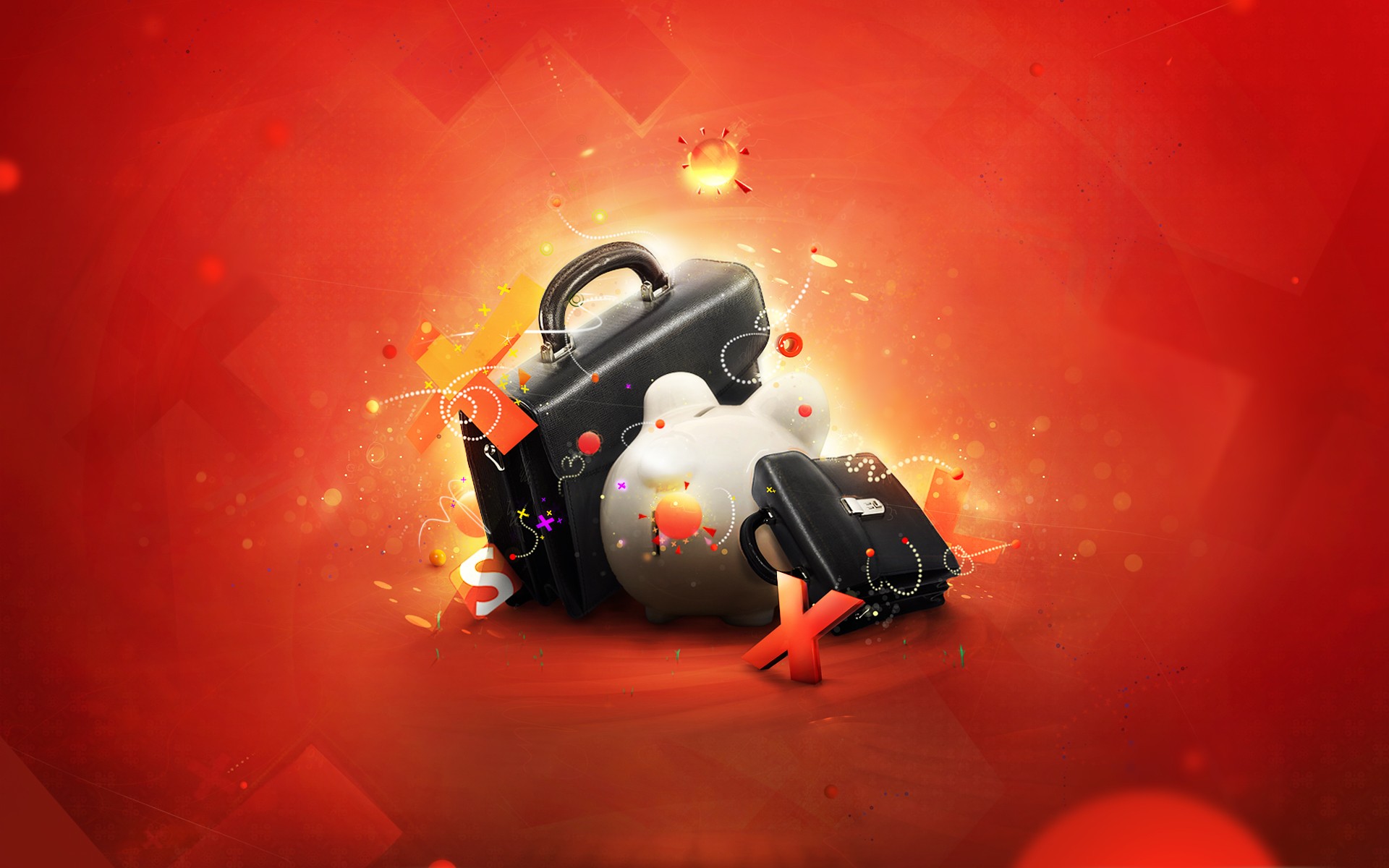 Porte-documents noirs et tirelire blanche sur fond rouge