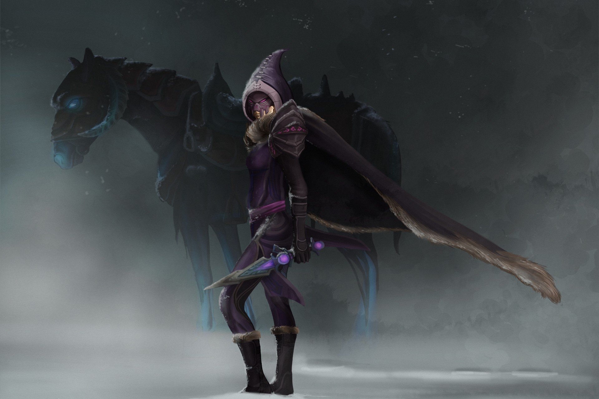 Cheval et fille avec un couteau dans le brouillard