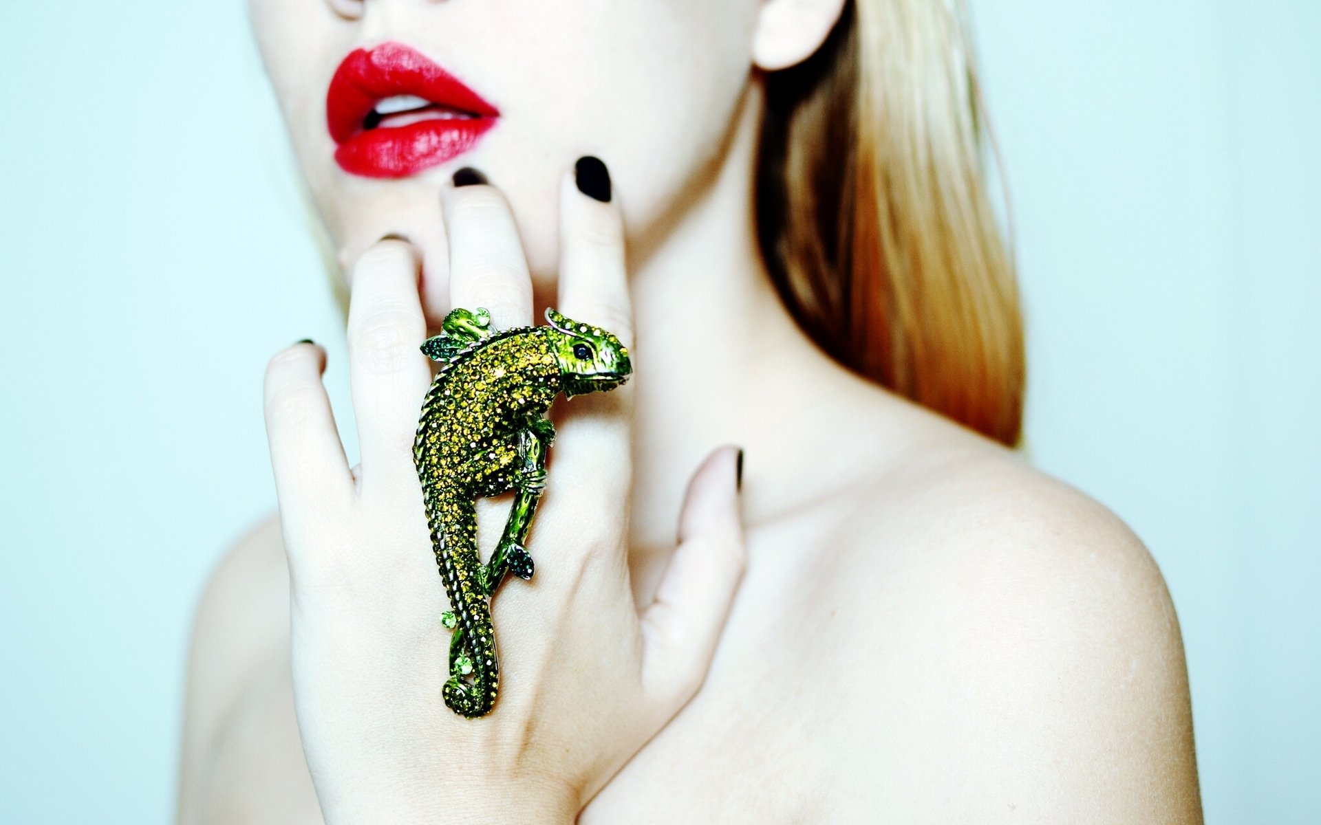 Fille avec une bague sur la main sous la forme d'un caméléon