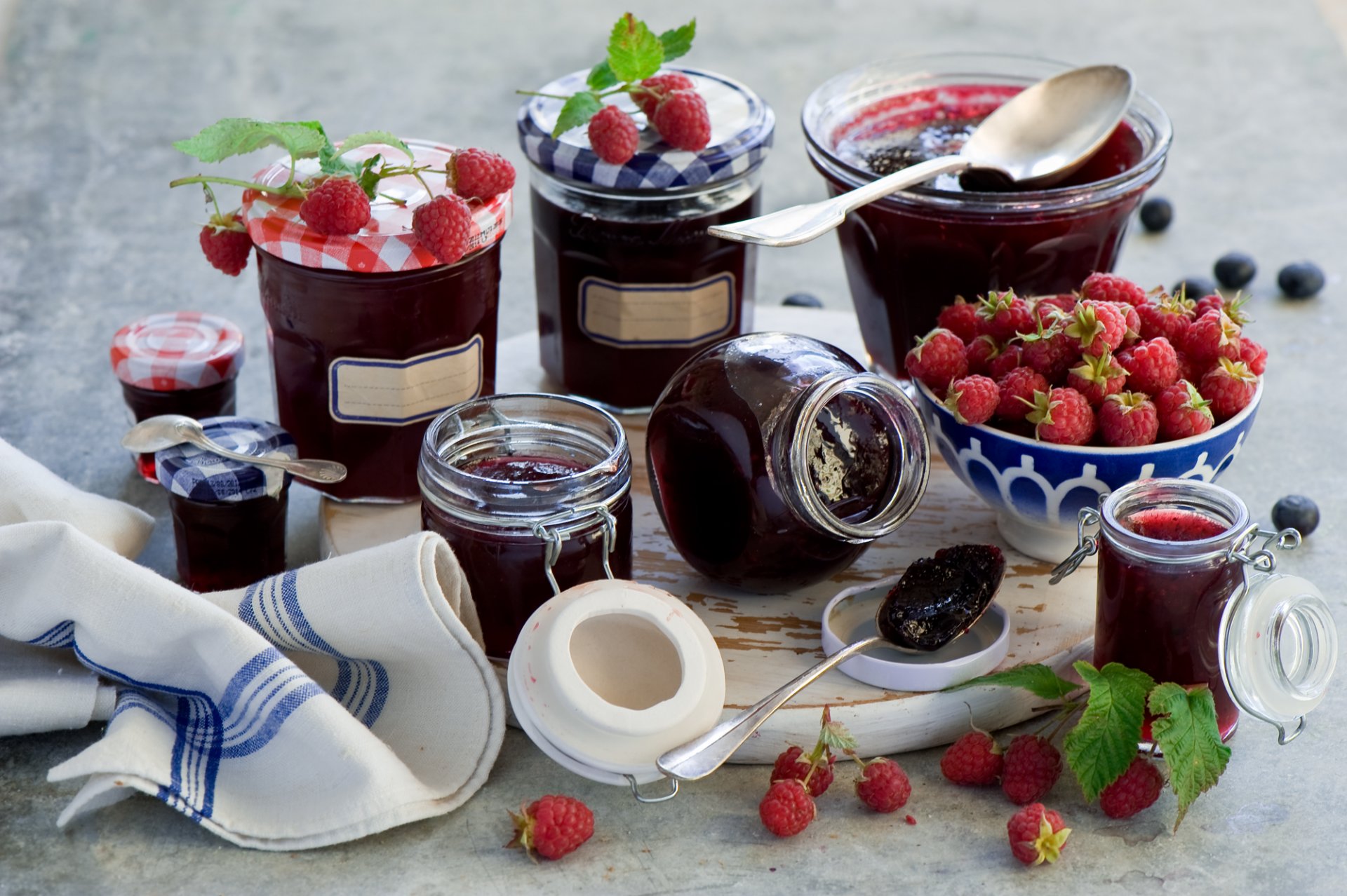 Sur la table, un pot de confiture et une assiette profonde avec des baies de framboises