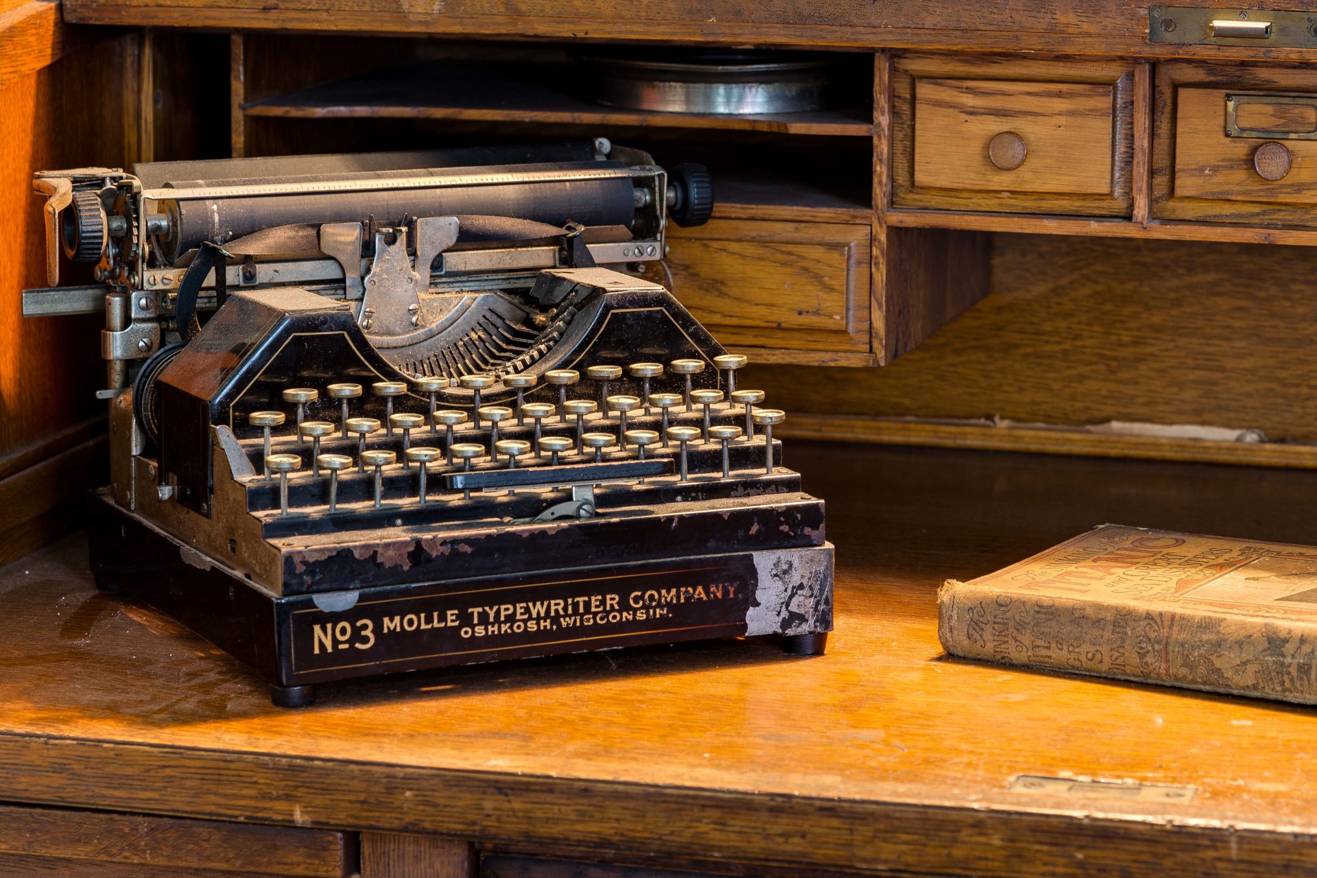 Vieille machine à écrire de rareté avec horloge sur fond d'escalier