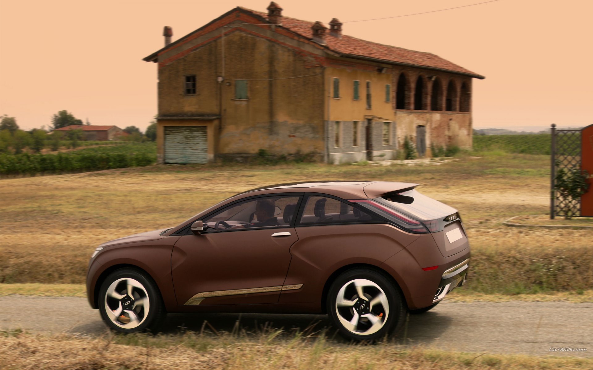Crossover lada brun dans un champ près d'une maison abandonnée