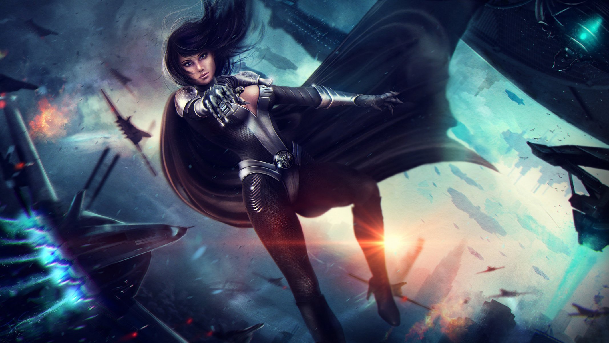 Fille déterminée super-héros en manteau noir sur fond de combat, explosions, avions volants