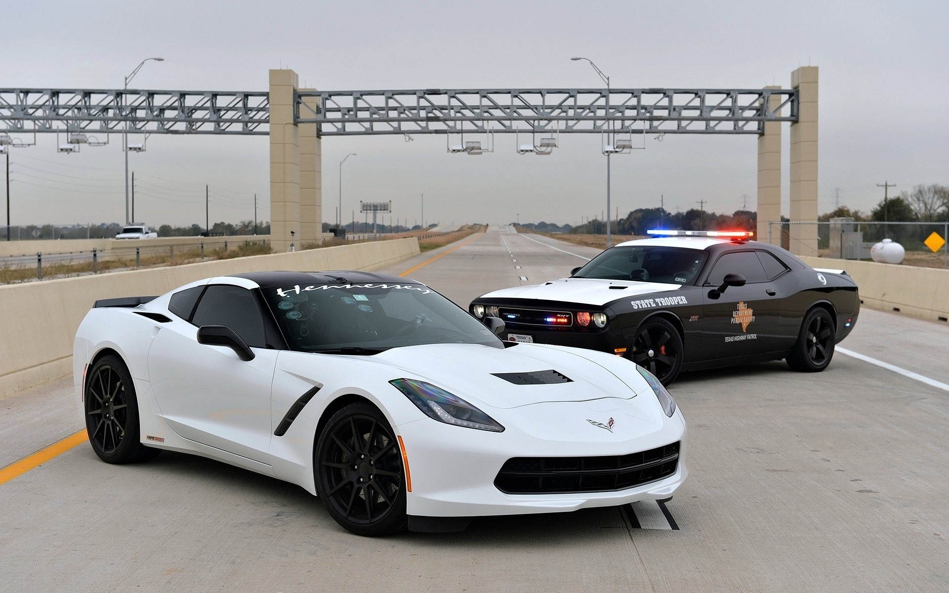 Deux voitures de sport sur la piste. corvette de course et de police blancheDeux voitures de sport sur la piste. Corvette de course et de police blanche