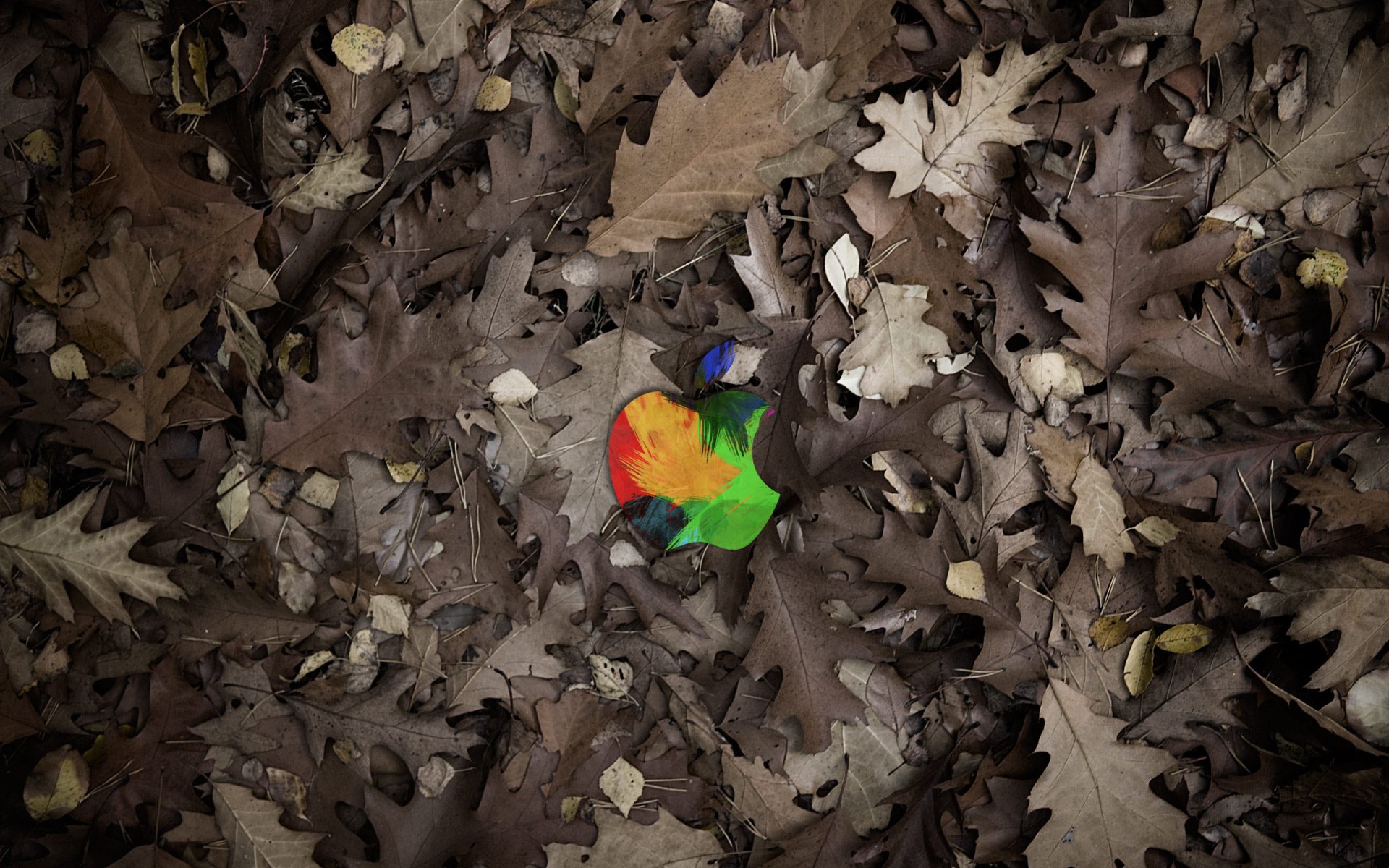 Apple logotype multicolore dans le feuillage tombéApple logotype multicolore dans le feuillage tombé