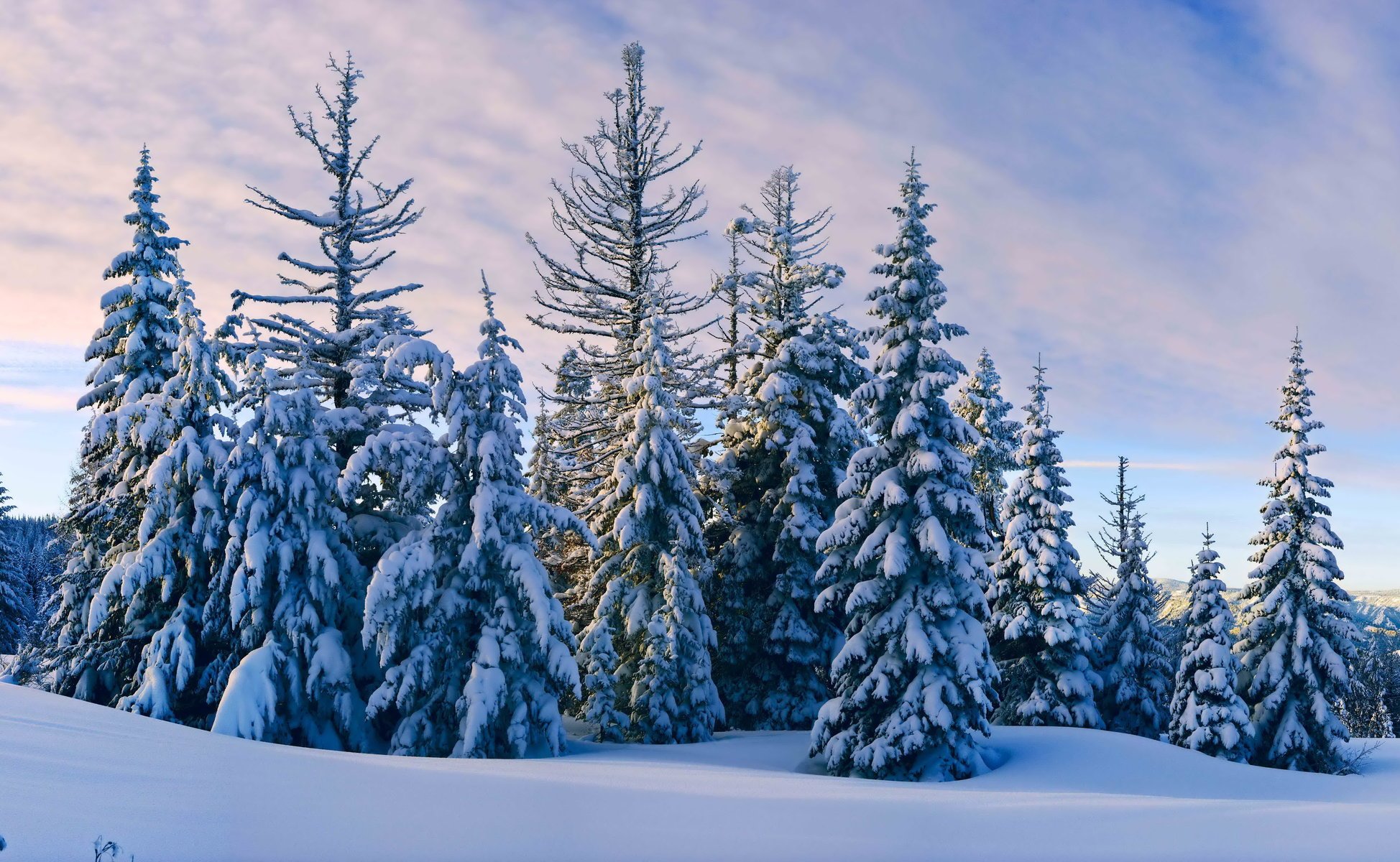 Pente d'une montagne enneigée en hiver avec des arbres de noël et un homme sur un snowboardPente d'une montagne enneigée en hiver avec des arbres de Noël et un homme sur un snowboard