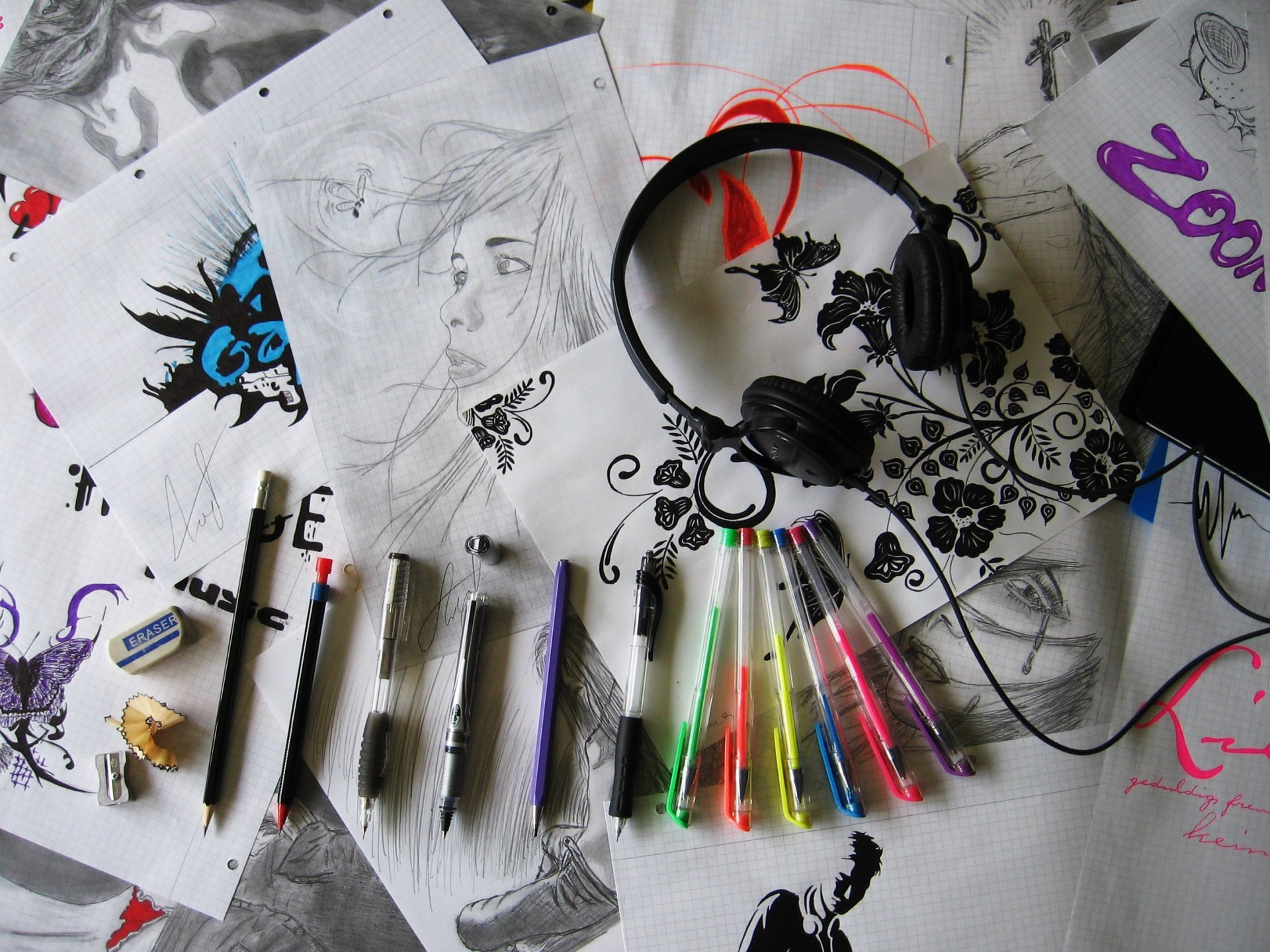 Croquis de l'artiste, sur les dessins se trouvent des stylos et des écouteursCroquis de l'artiste, sur les dessins se trouvent des stylos et des écouteurs