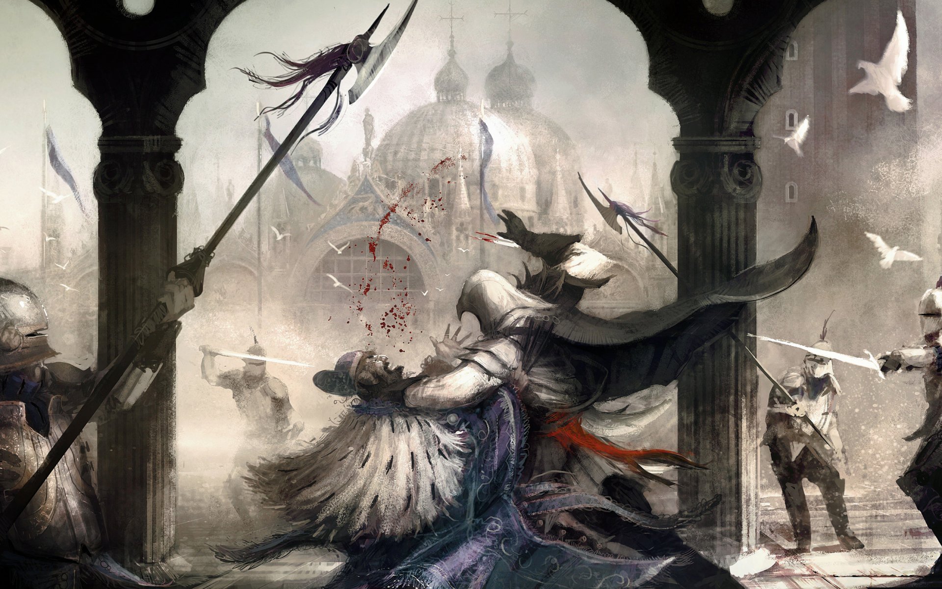Assassin avec une flèche dans les mains sur fond de cielAssassin avec une flèche dans les mains sur fond de ciel