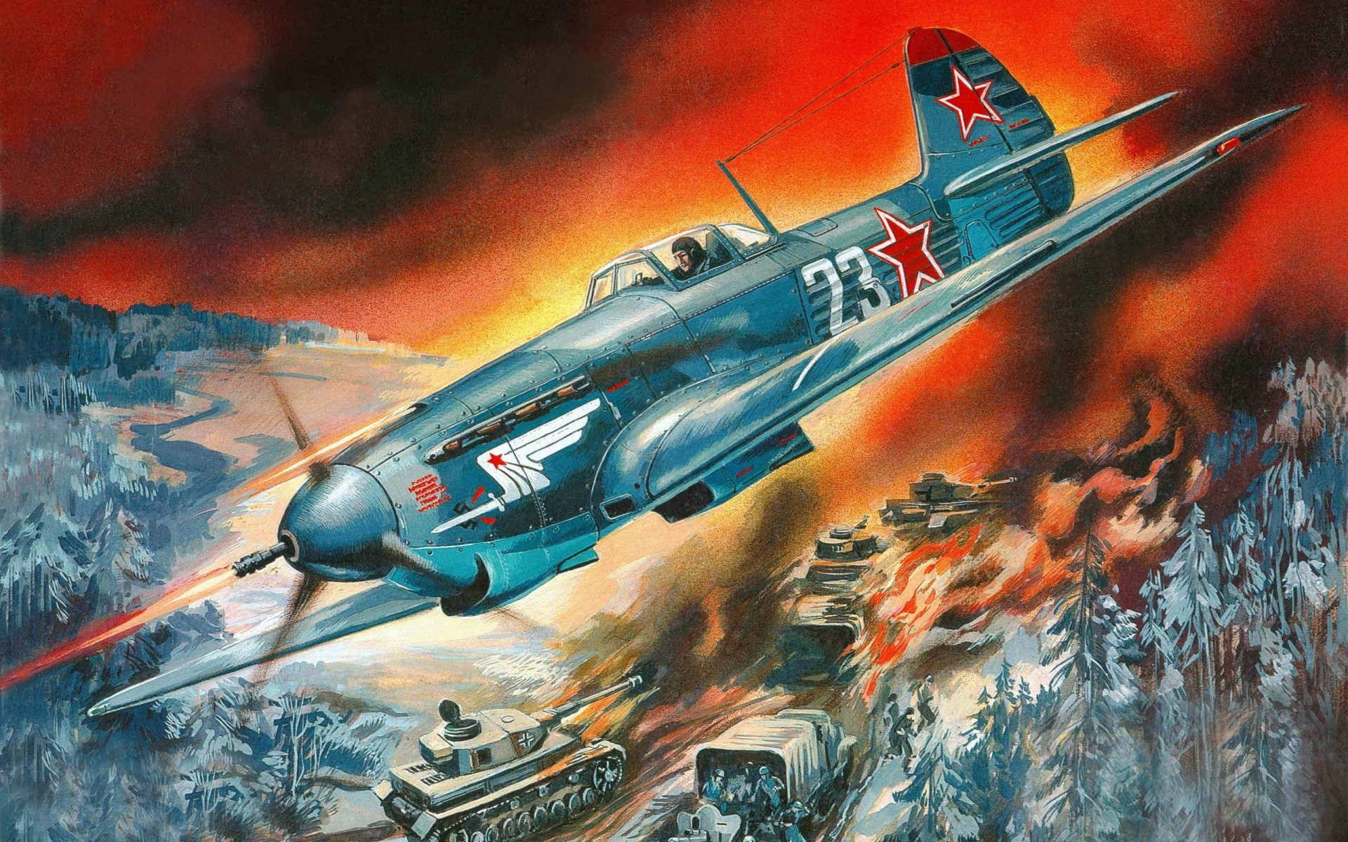 Un chasseur monomoteur dans le ciel attaque des chars allemandsUn chasseur monomoteur dans le ciel attaque des chars allemands