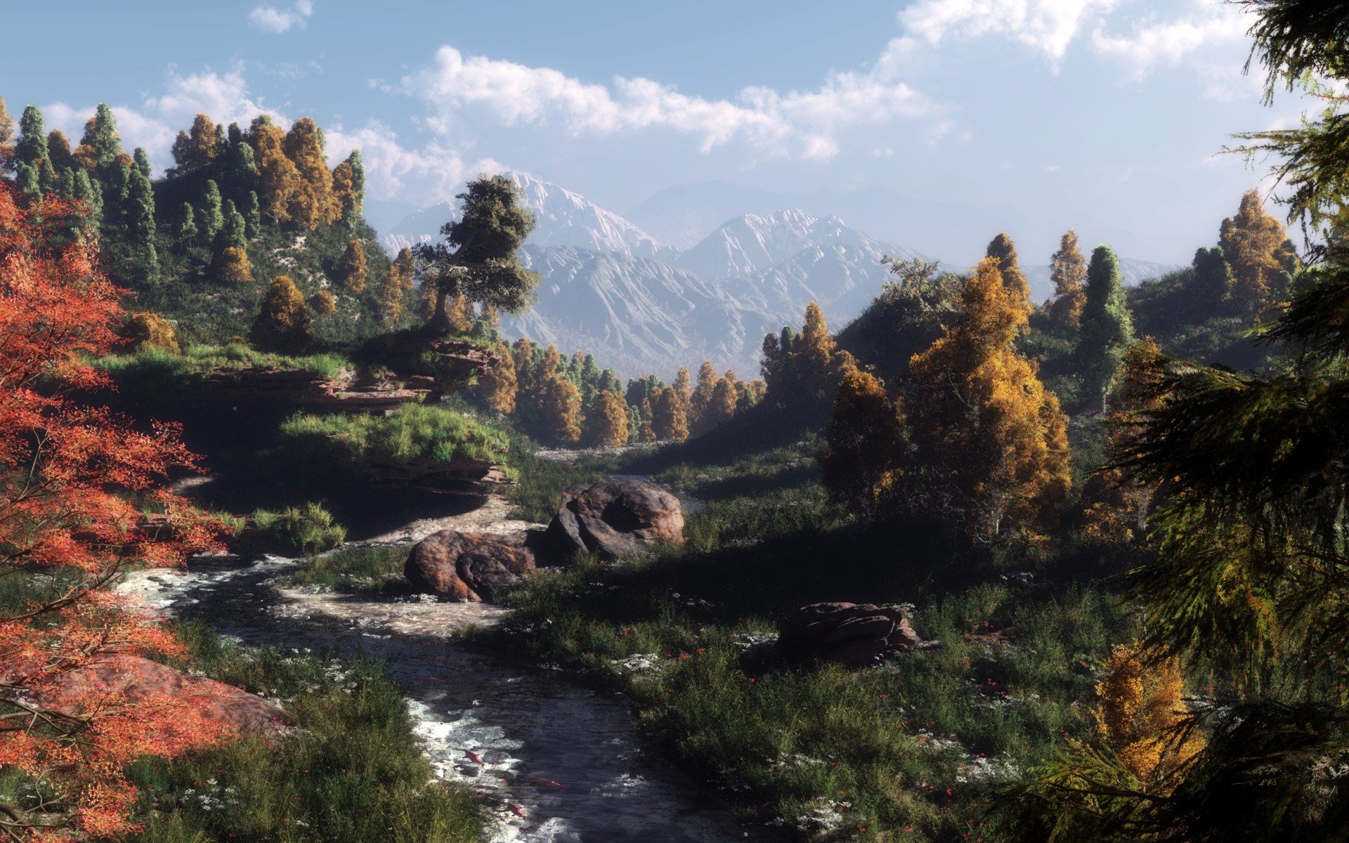 De montagne à la rivière au milieu de la verdure et des arbresDe montagne à la rivière au milieu de la verdure et des arbres