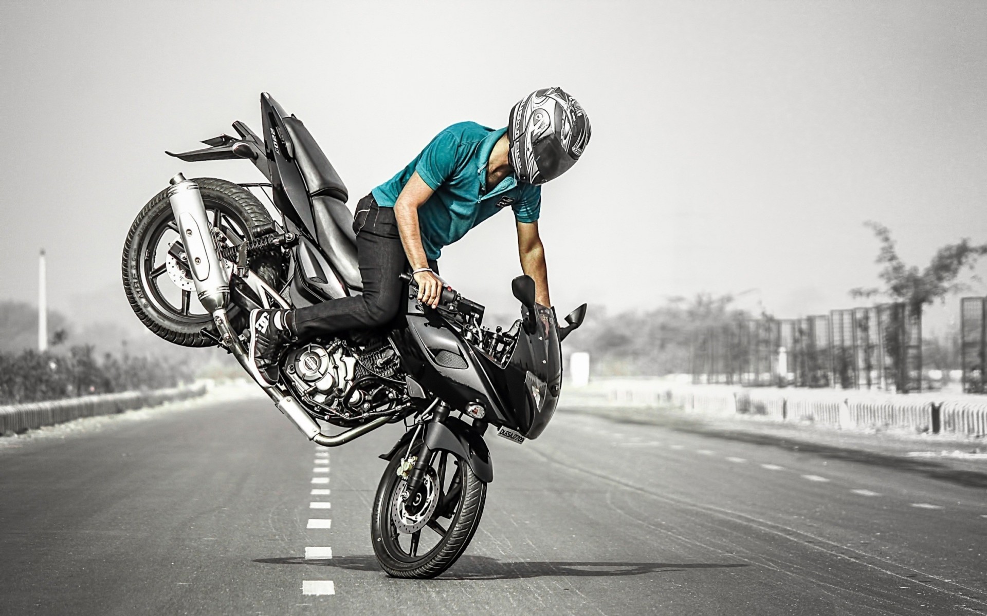 Un motocycliste fait une cascade dangereuse sur une moto noire au milieu de la routeUn motocycliste fait une cascade dangereuse sur une moto noire au milieu de la route