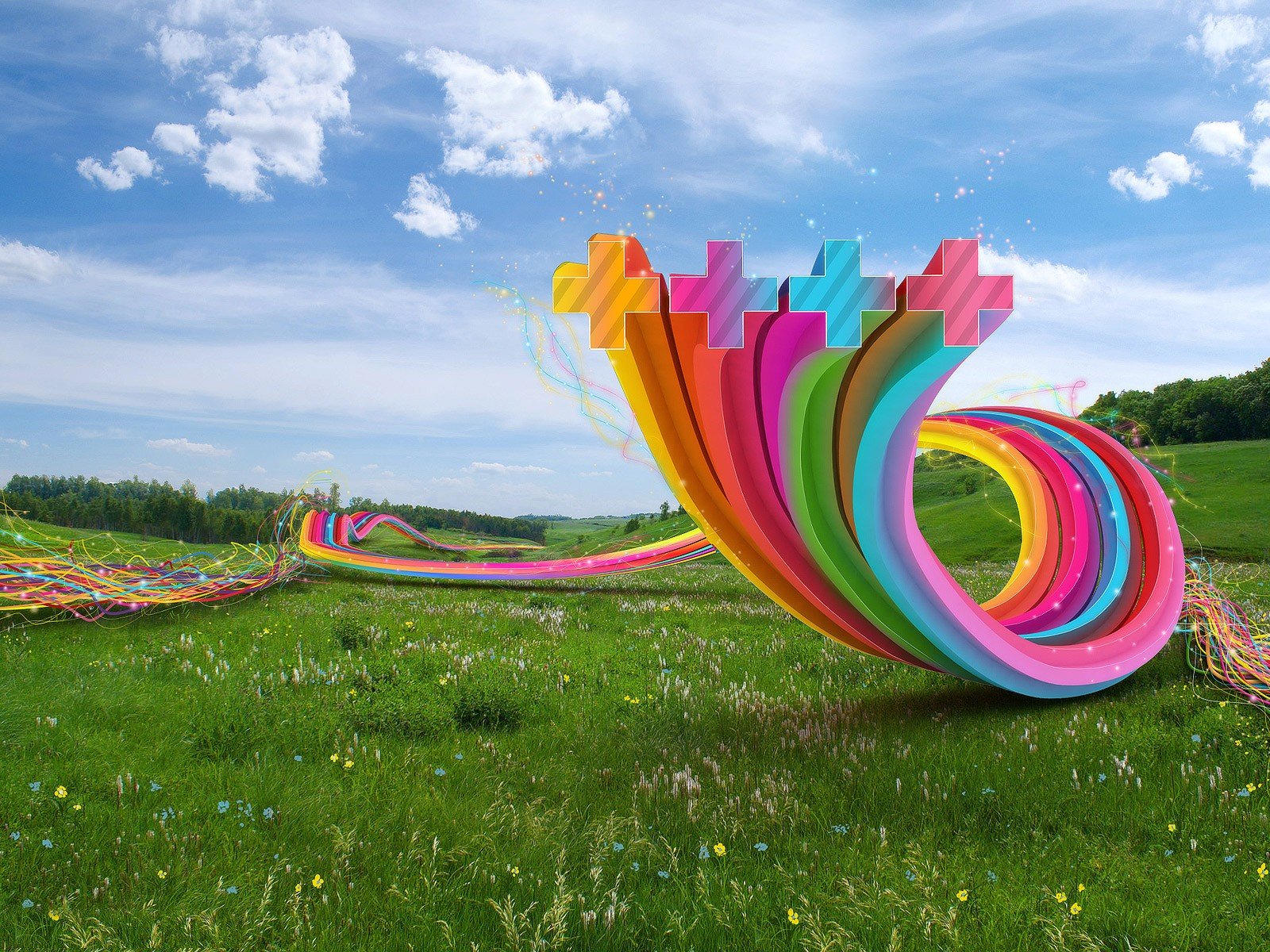Sur le fond brun, des bandes ondulées rouges et jaunes. Avantages, cercles, carrés, losanges entre eux