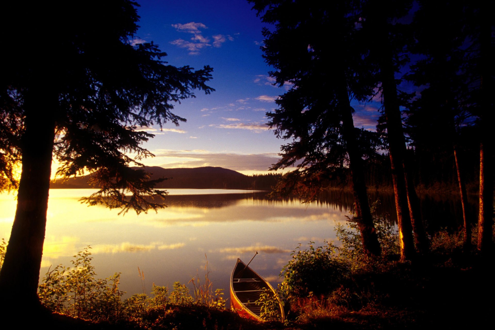 Bateau sur le lac dans les arbres et beau coucher de soleilBateau sur le lac dans les arbres et beau coucher de soleil