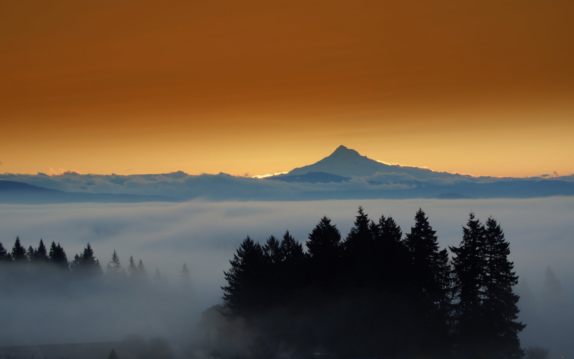 Arbres et coucher de soleil sur le sommet de la montagneArbres et coucher de soleil sur le sommet de la montagne