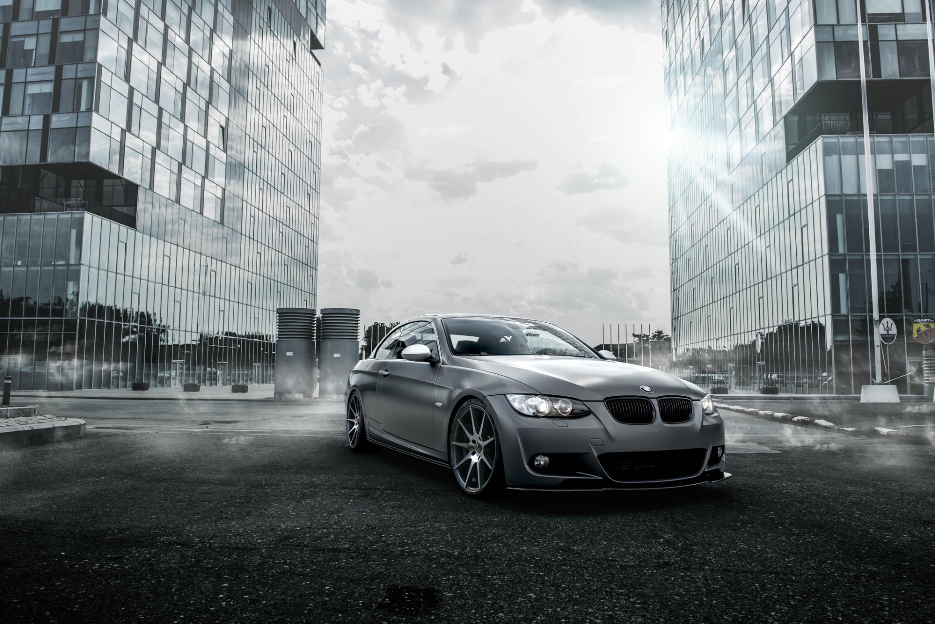 Voiture bmw argent sur la route grise sous le ciel brunVoiture BMW argent sur la route grise sous le ciel brun