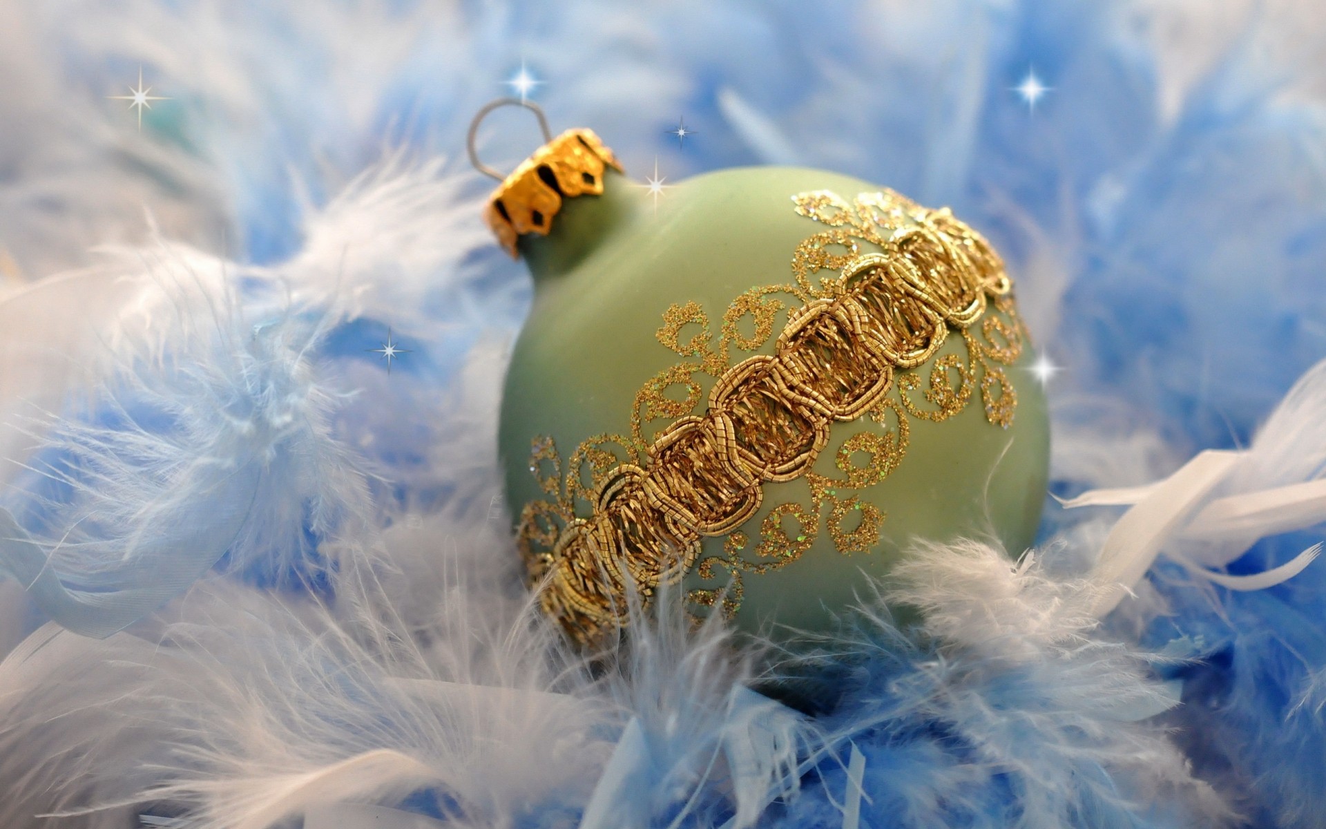 Boule de noël avec des motifs dorés sur des plumes blanches et bleuesBoule de Noël avec des motifs dorés sur des plumes blanches et bleues
