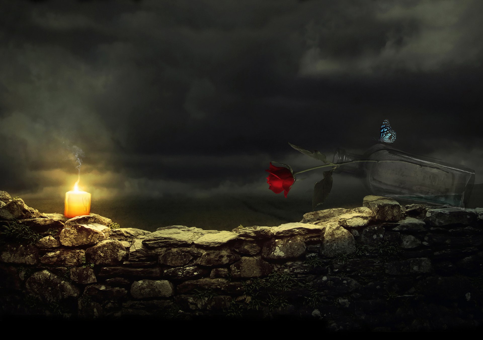 Bougie, papillon et rose rouge dans une bouteille sur une haie de pierre dans la nuitBougie, papillon et rose rouge dans une bouteille sur une haie de pierre dans la nuit