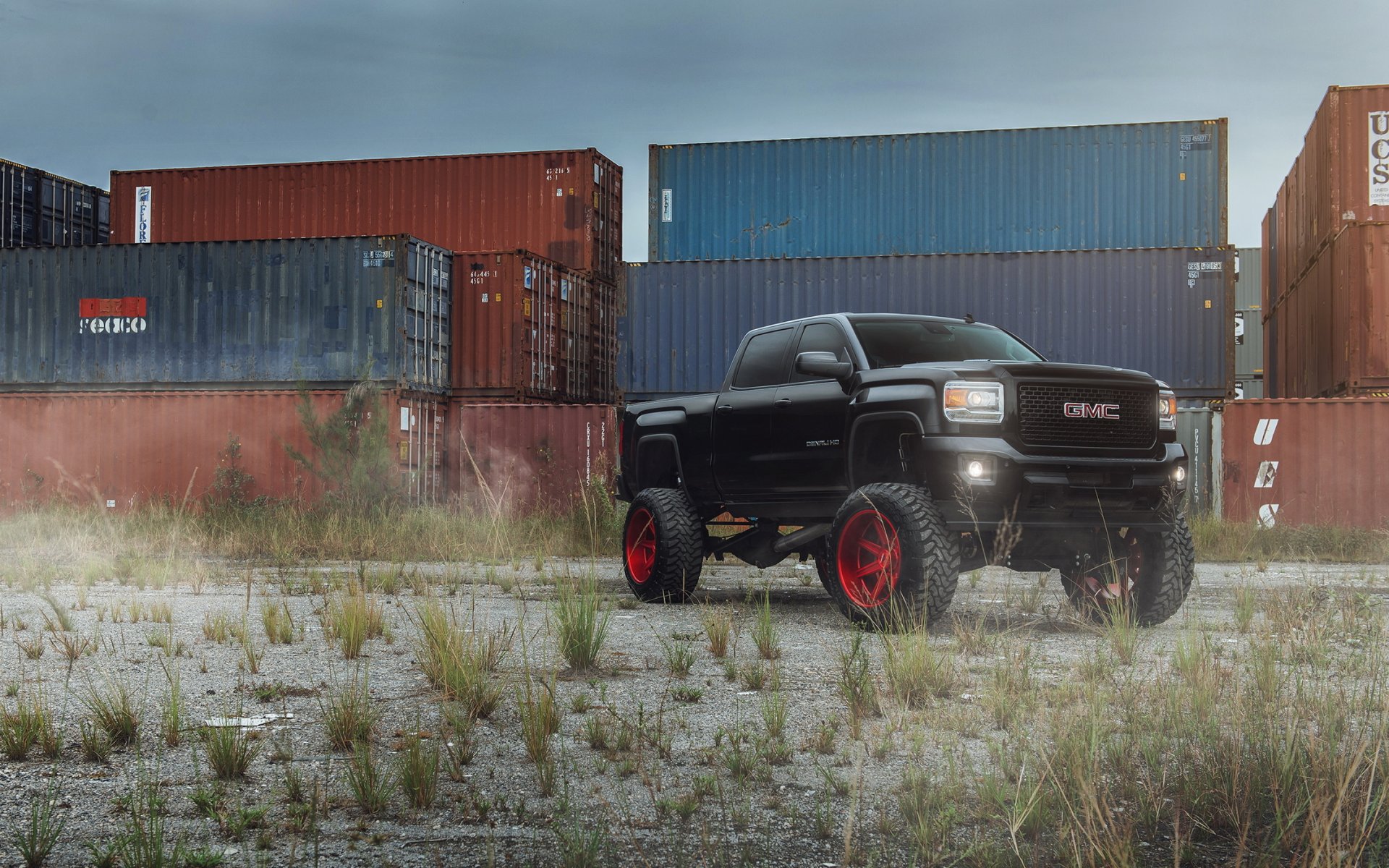 Pick-up noir avec tuning sur fond de conteneurs