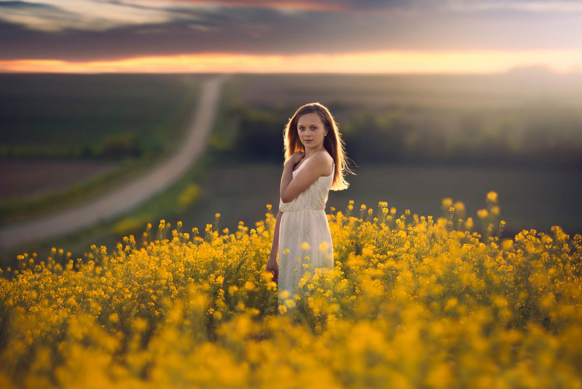 La jeune fille dans un champ de fleurs et disparaissant au loin la route