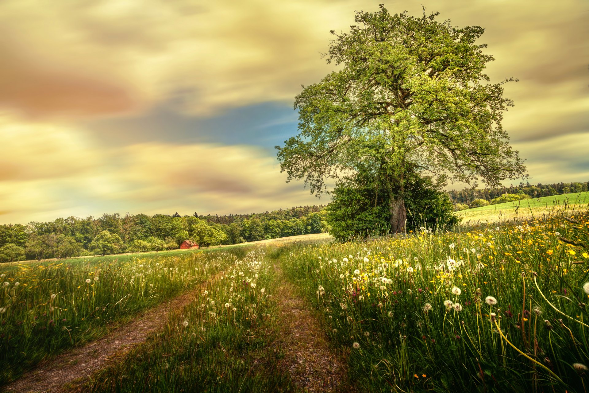 En été, la nature orne le champ de belles variétés de fleurs telles que des marguerites, des herbes vertes, des prairies et un ciel dégagé avec des nuages comme de la laine de cotonEn été, la nature orne le champ de belles variétés de fleurs telles que des marguerites, des herbes vertes, des prairies et un ciel dégagé avec des nuages comme de la laine de coton
