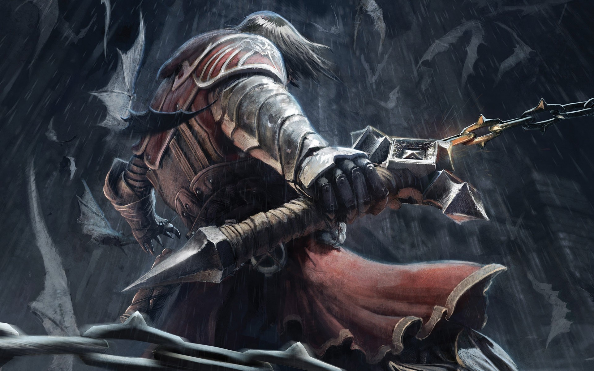 Guerrier avec des armes se faufile à travers les chauves-souris