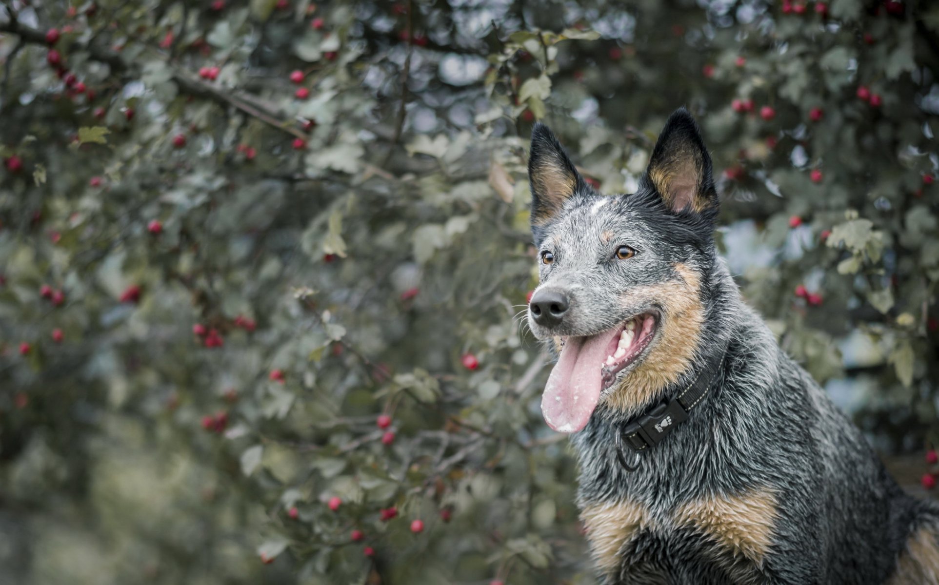 Un chien mouillé se tient à côté d'un sorbier