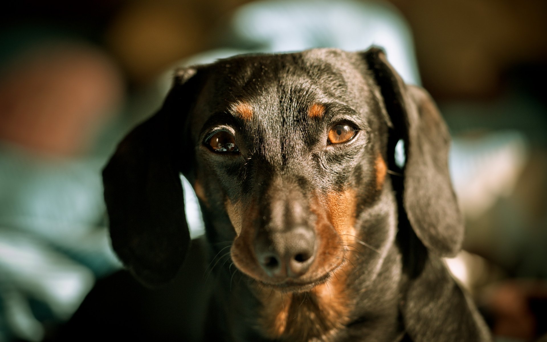 Le chien de couleur foncée regarde avec un regard intelligentLe chien de couleur foncée regarde avec un regard intelligent