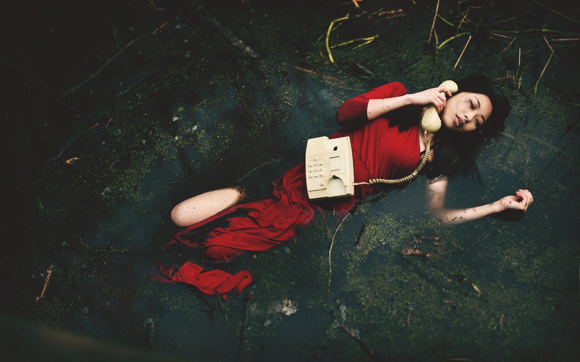 La jeune fille dans une robe rouge avec un téléphone se trouve dans le marais