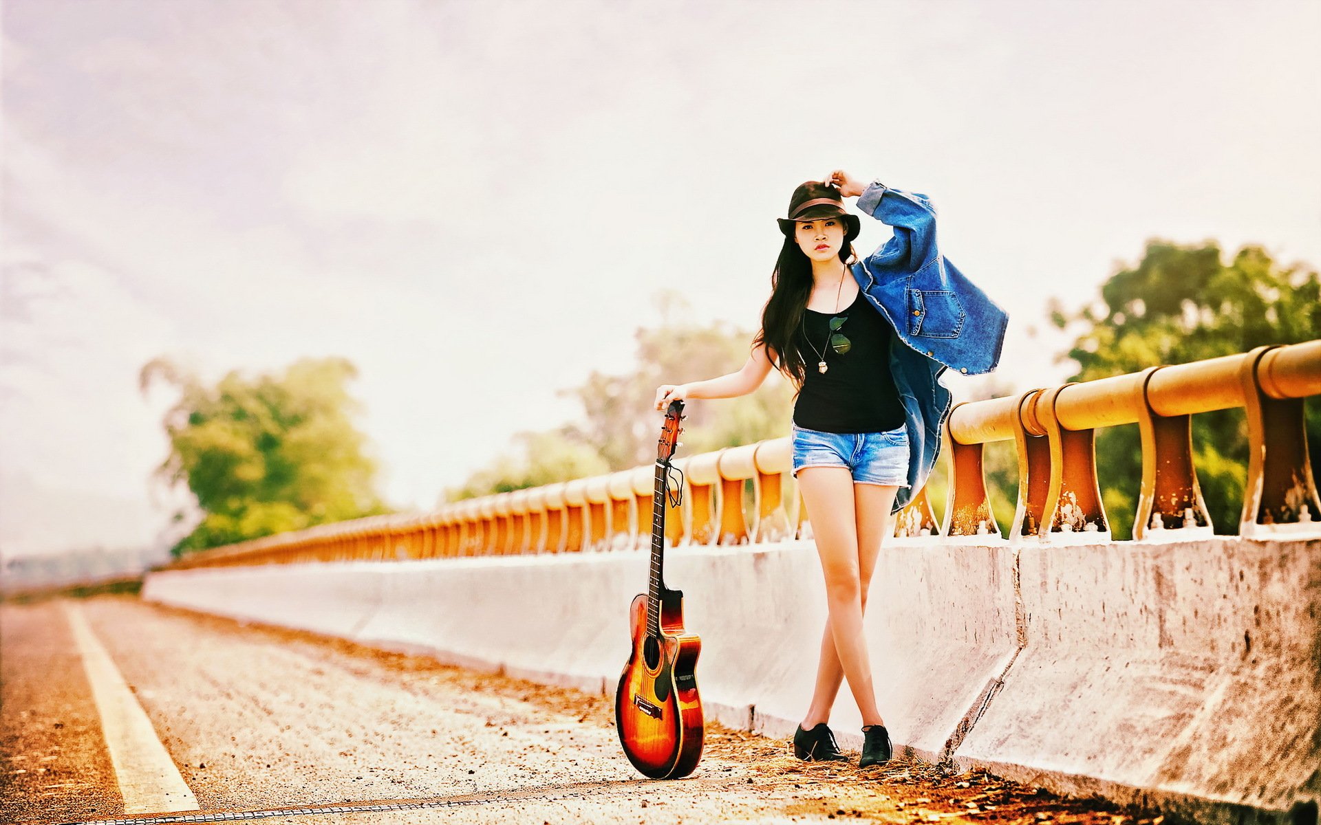 Fille sur la route avec une guitare