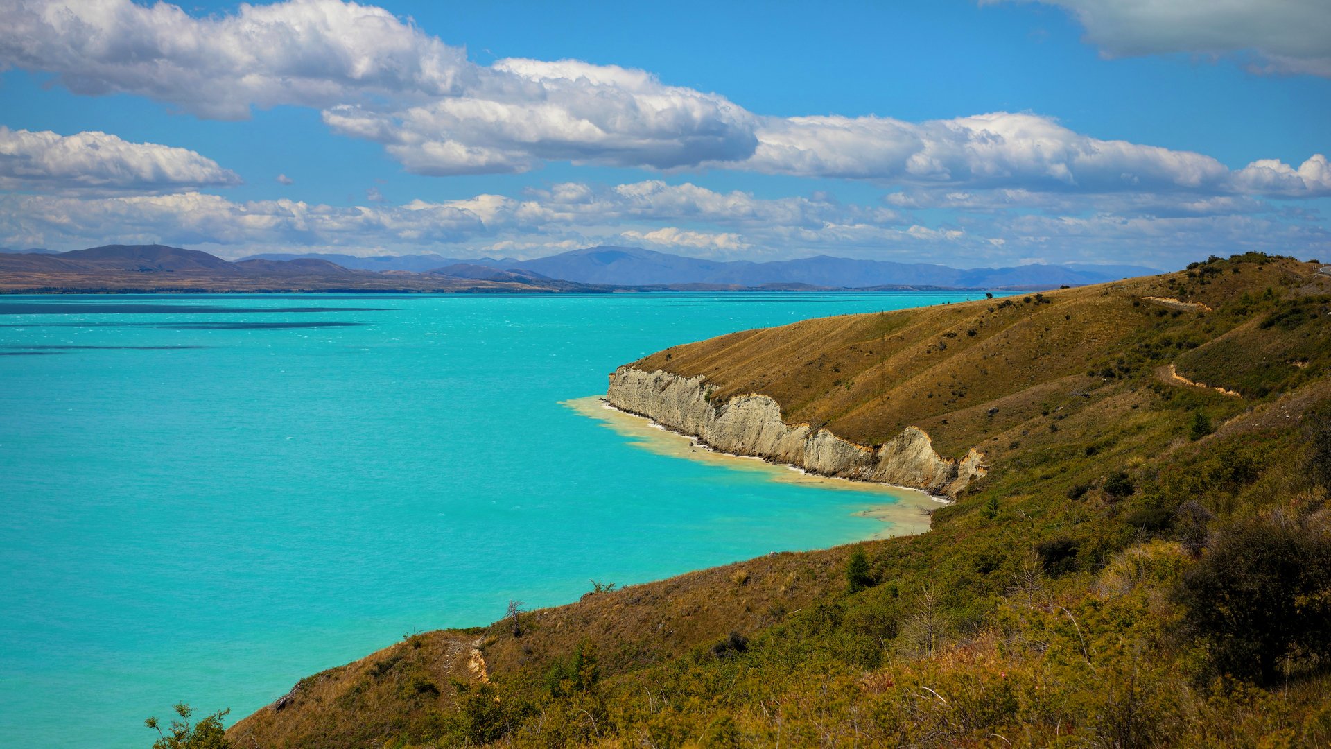 Collines norvégiennes avec de petites maisons sur fond de baieCollines norvégiennes avec de petites maisons sur fond de baie