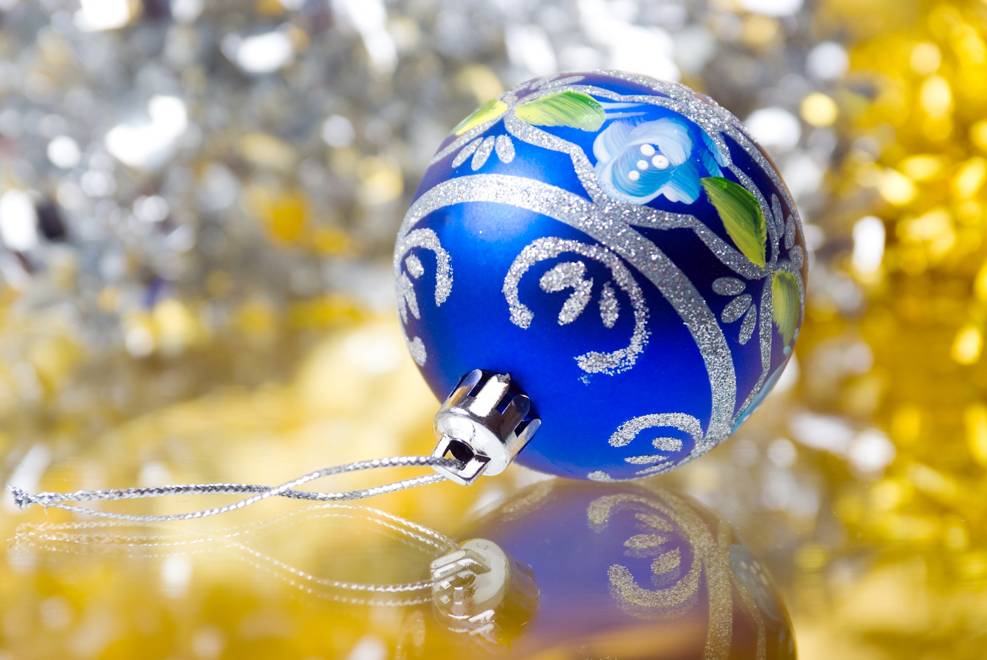 Arbre de Noël avec des boules de Noël de couleur bleue et des rubans blancs