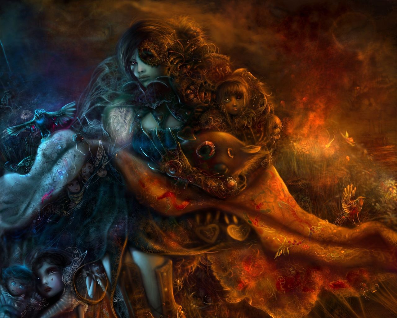 Fille de fantaisie en rouge avec une épée sur un loup assommé