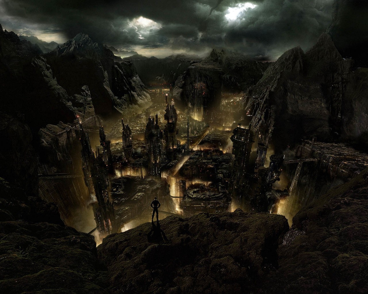L'homme qui marche dans la ville de nuit est dans les rochersL'homme qui marche dans la ville de nuit est dans les rochers
