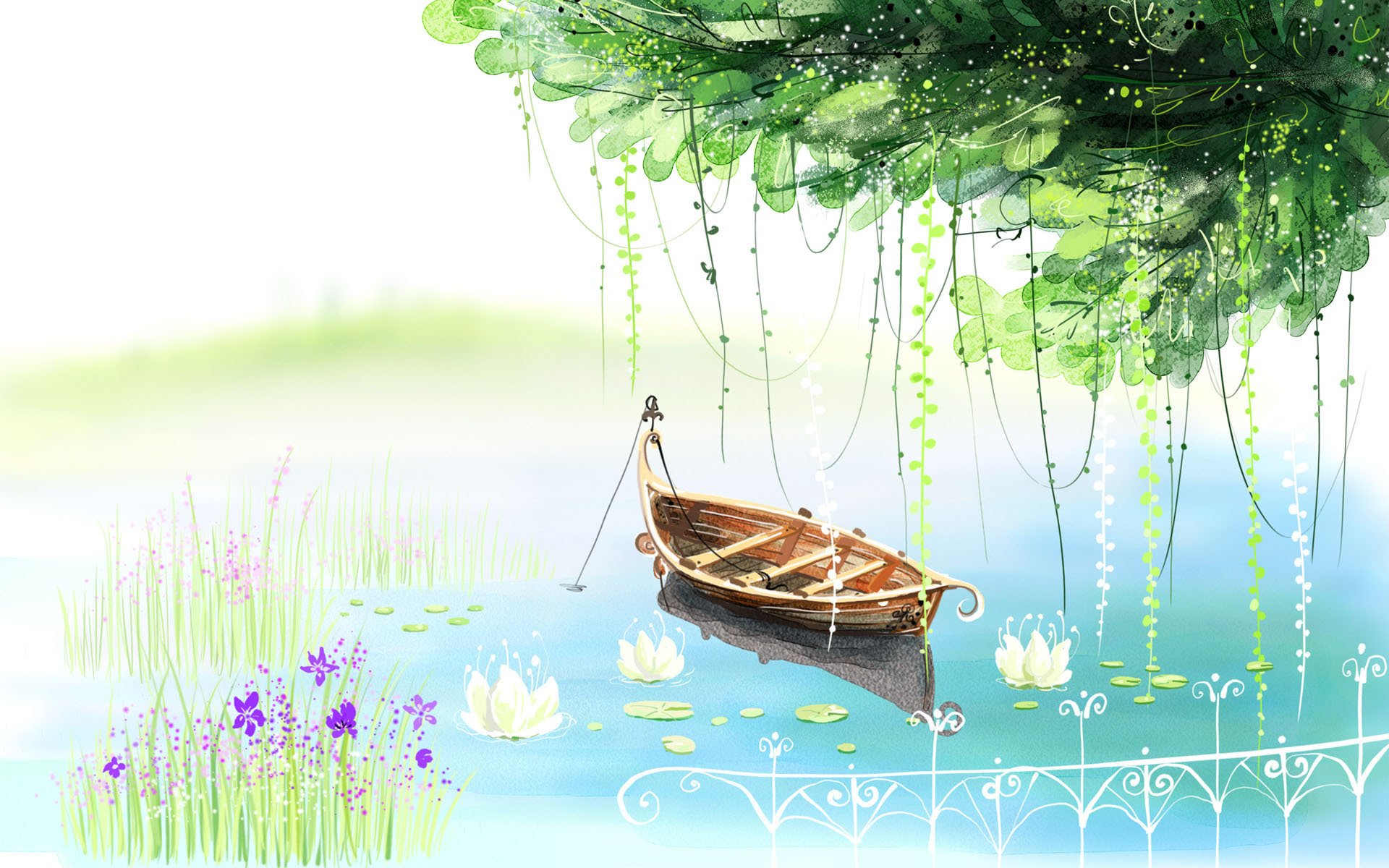Le dessin d'un bateau dans le lac avec des nénupharsLe dessin d'un bateau dans le lac avec des nénuphars