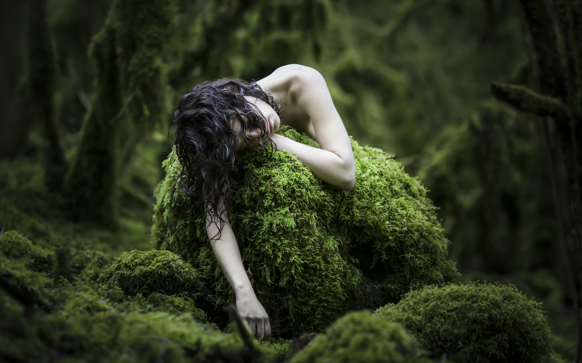 Pâle de la jeune fille dans la forêt sur la mousse