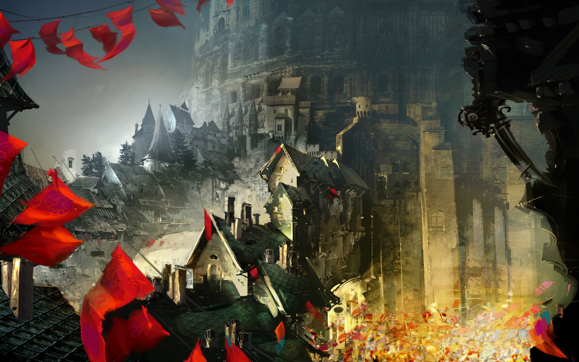 Ville avec des maisons grises et des drapeaux rougesVille avec des maisons grises et des drapeaux rouges