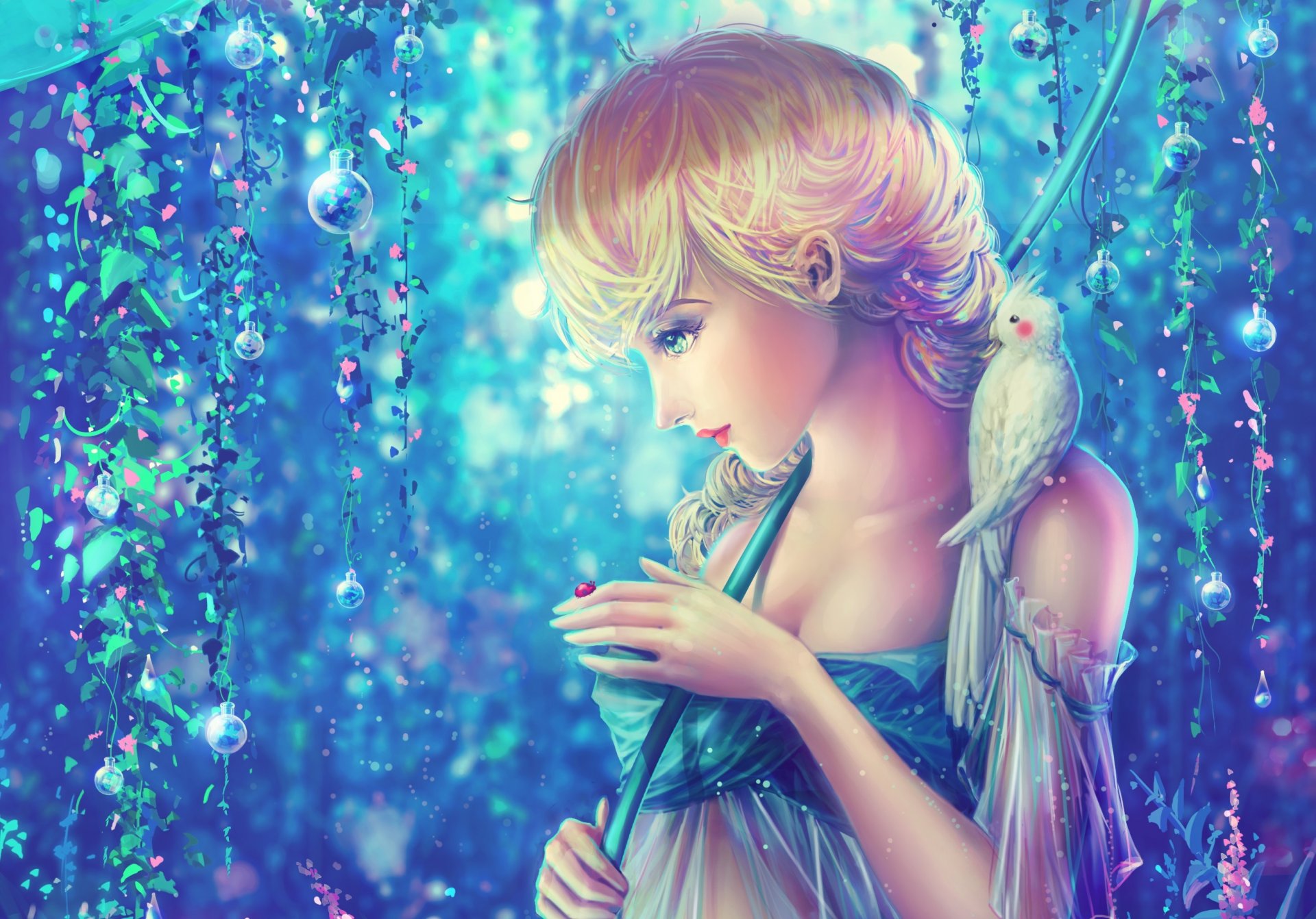 Fille avec un perroquet sur l'épaule en regardant la coccinelleFille avec un perroquet sur l'épaule en regardant la coccinelle