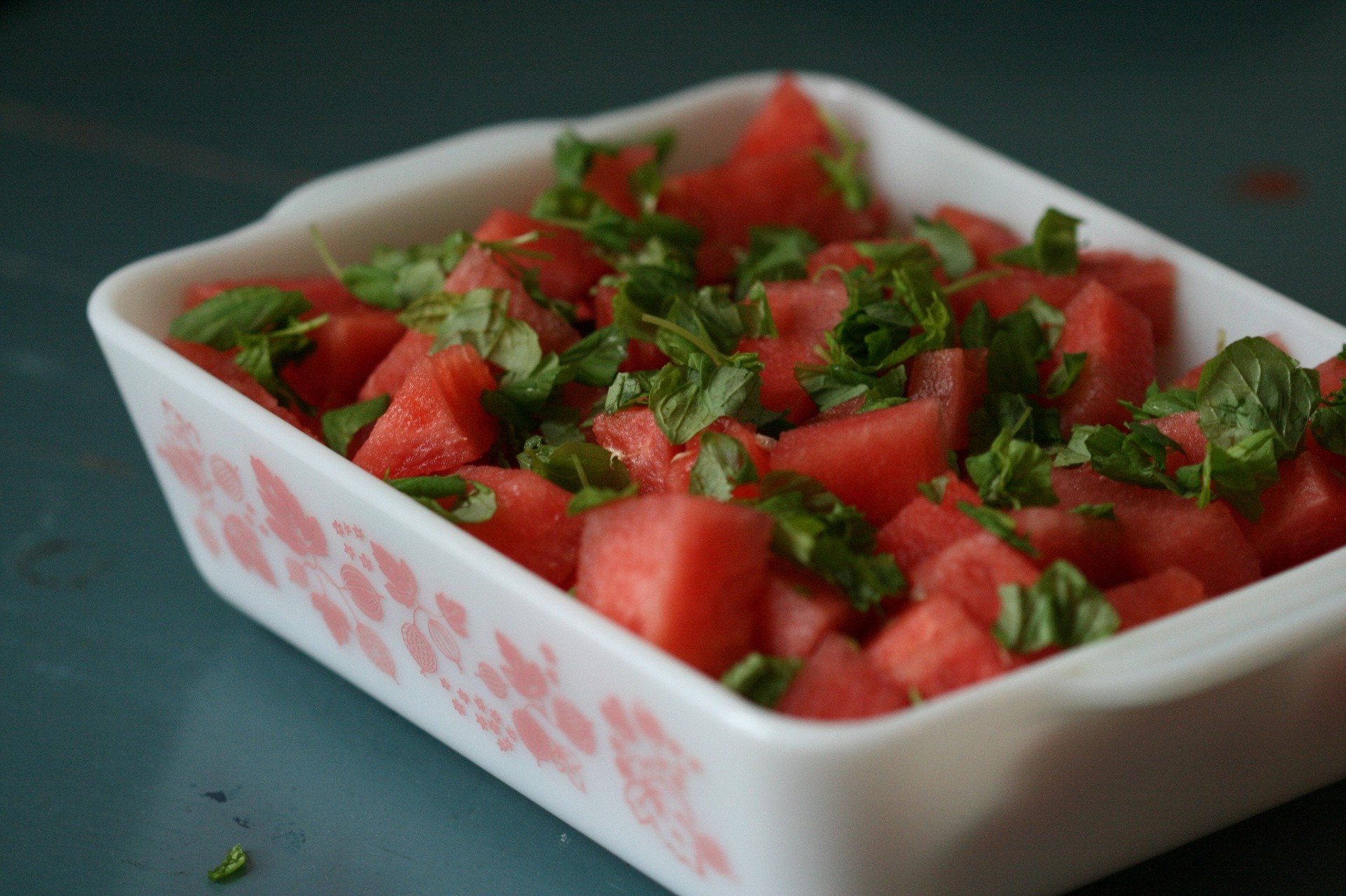Pastèque hachée dans une assiette avec des légumes vertsPastèque hachée dans une assiette avec des légumes verts