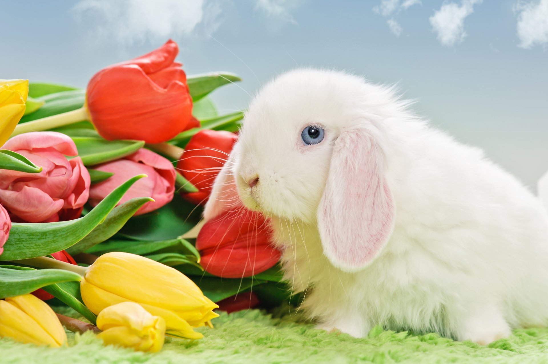 Chiot blanc est assis sur l'herbe verte et regarde de côtéChiot blanc est assis sur l'herbe verte et regarde de côté