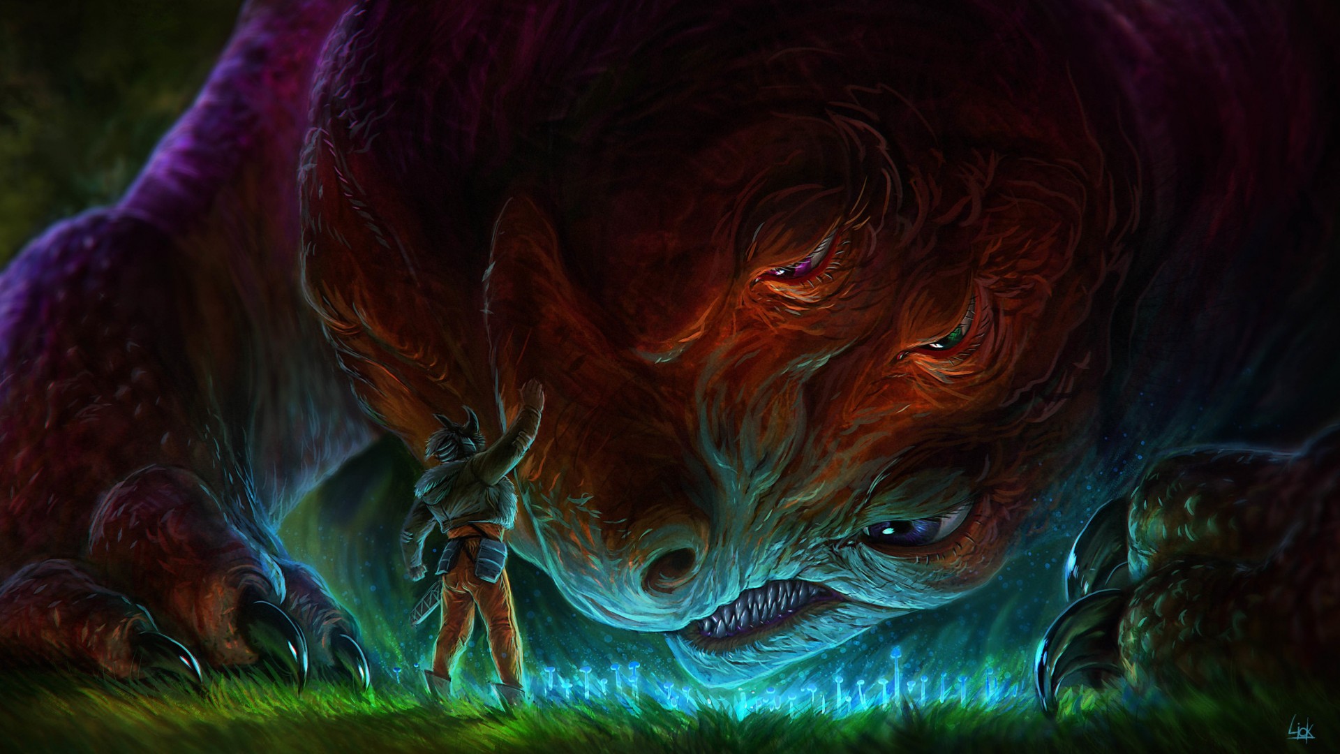 Héros face à face avec un monstre géant aux yeux multiplesHéros face à face avec un monstre géant aux yeux multiples