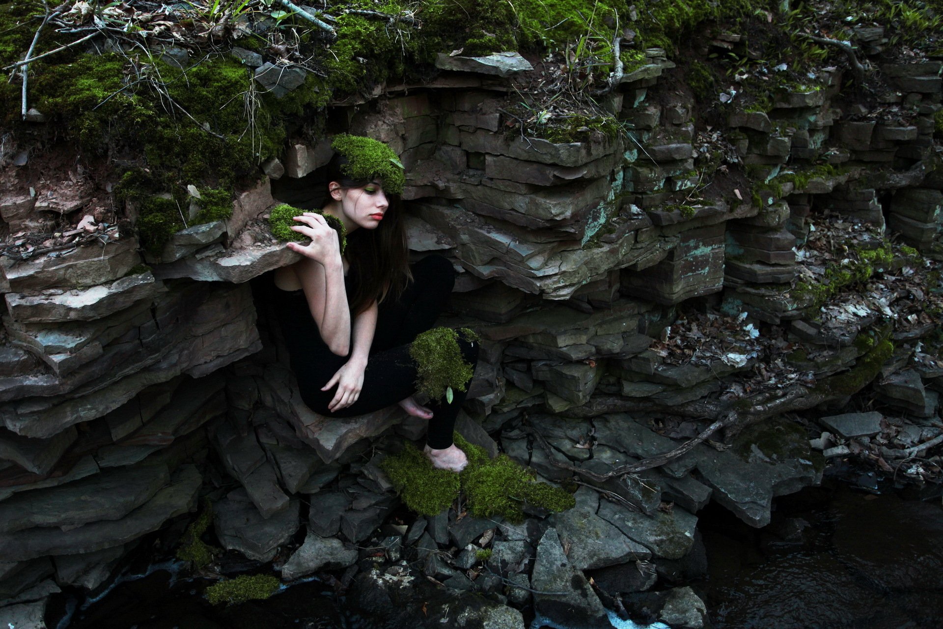 Fille sur le rebord d'une falaise recouverte de mousseFille sur le rebord d'une falaise recouverte de mousse