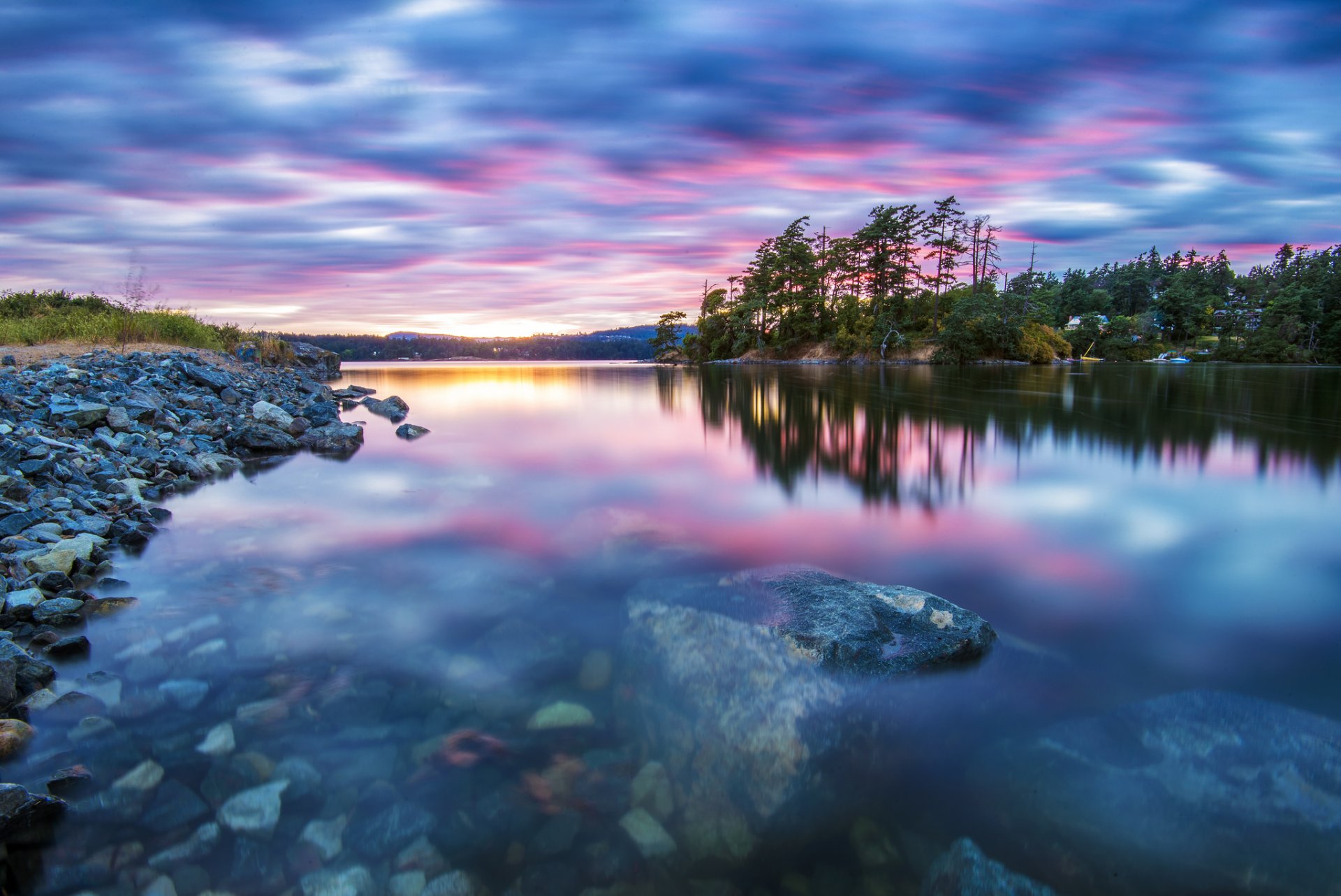 Coucher de soleil avec vue sur le lac près d'un arbre tombéCoucher de soleil avec vue sur le lac près d'un arbre tombé